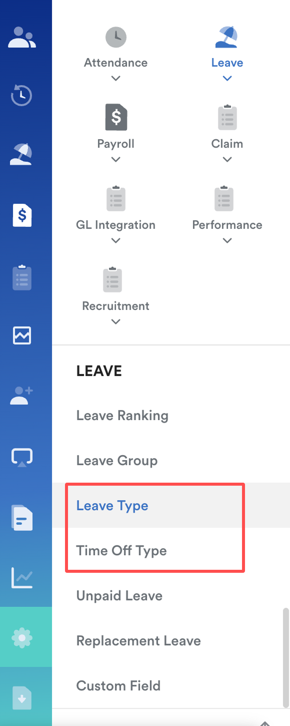 Path: Setting > Leave > Leave Type or Time Off Type
