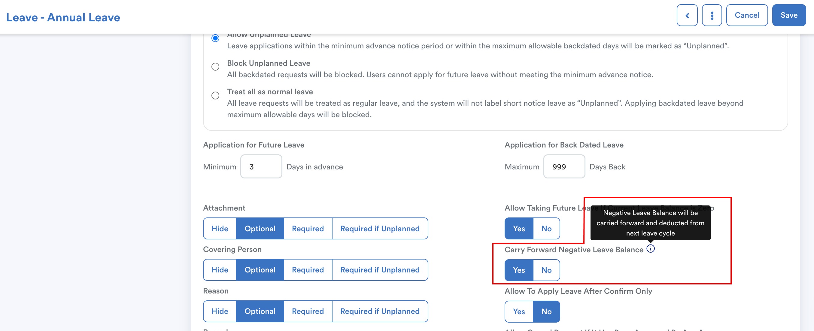 If the setting is turned on, negative leave or time-off balances will be carried forward and deducted from the total entitlement.