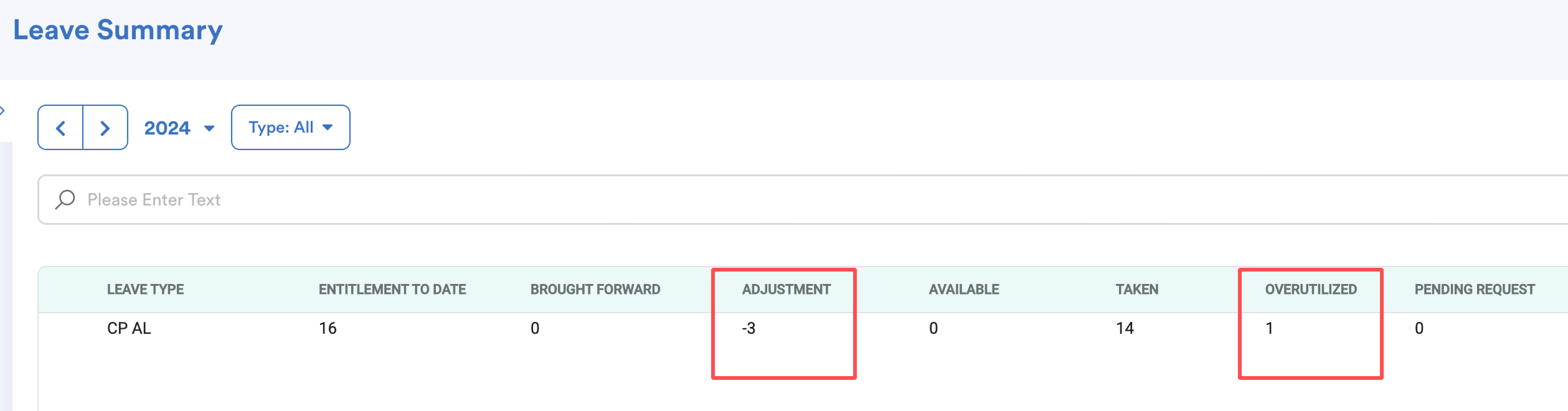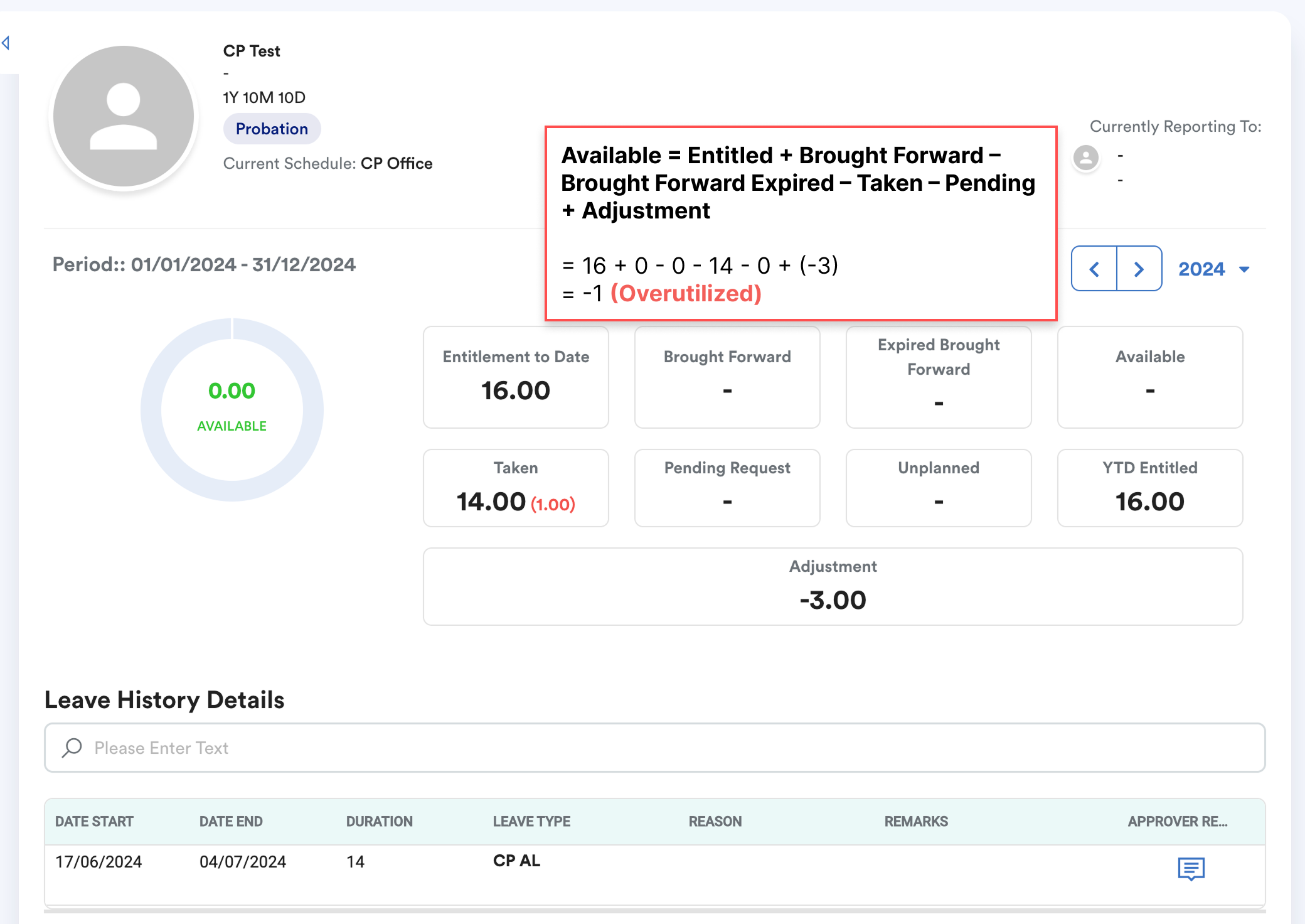 For testing, we applied a negative 3-day adjustment in the Leave Summary; the leave balance shows an overutilization of 1 day.