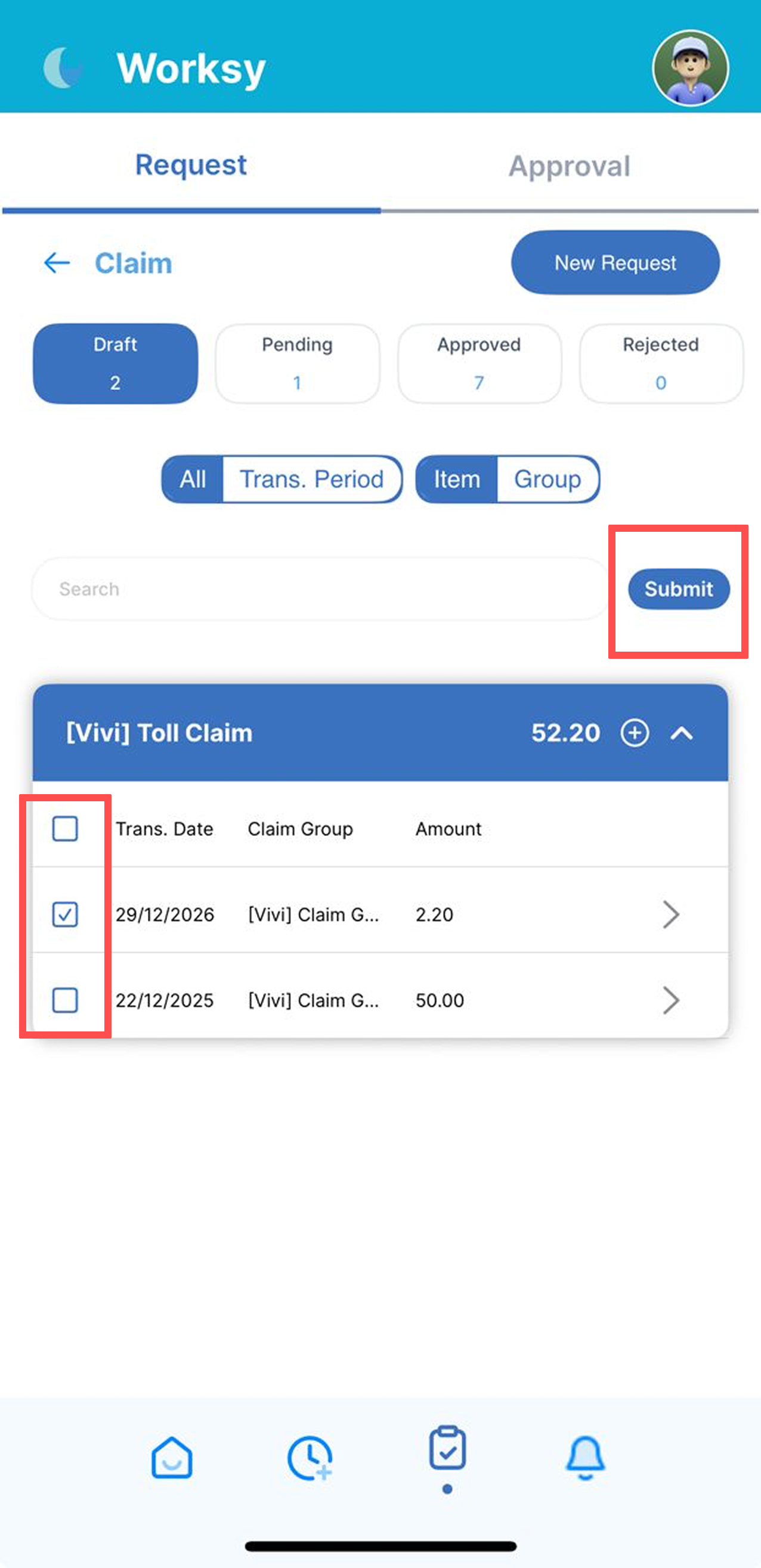 After reviewing the draft, tick the checkbox and click Submit to send your claim for approval.