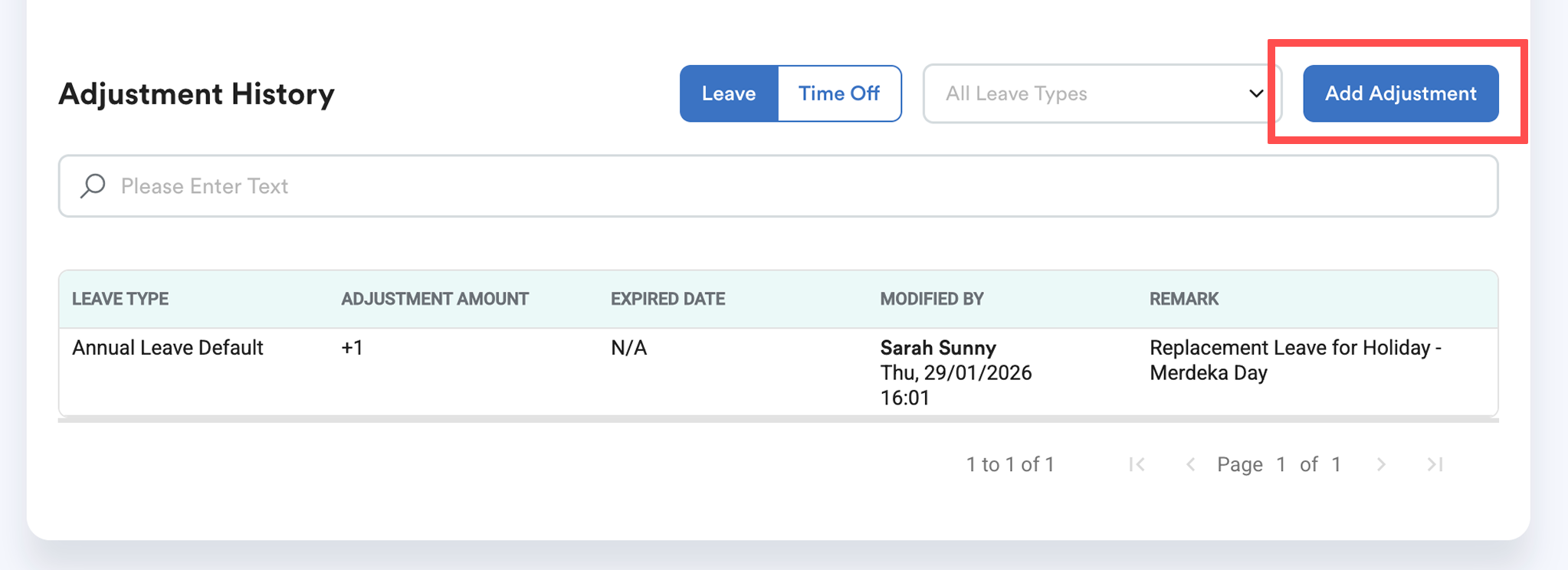 For example, if an adjustment of "-2" was entered to deduct 2 days from the leave balance, you would need to add another adjustment of "2" days to reverse the previous deduction.