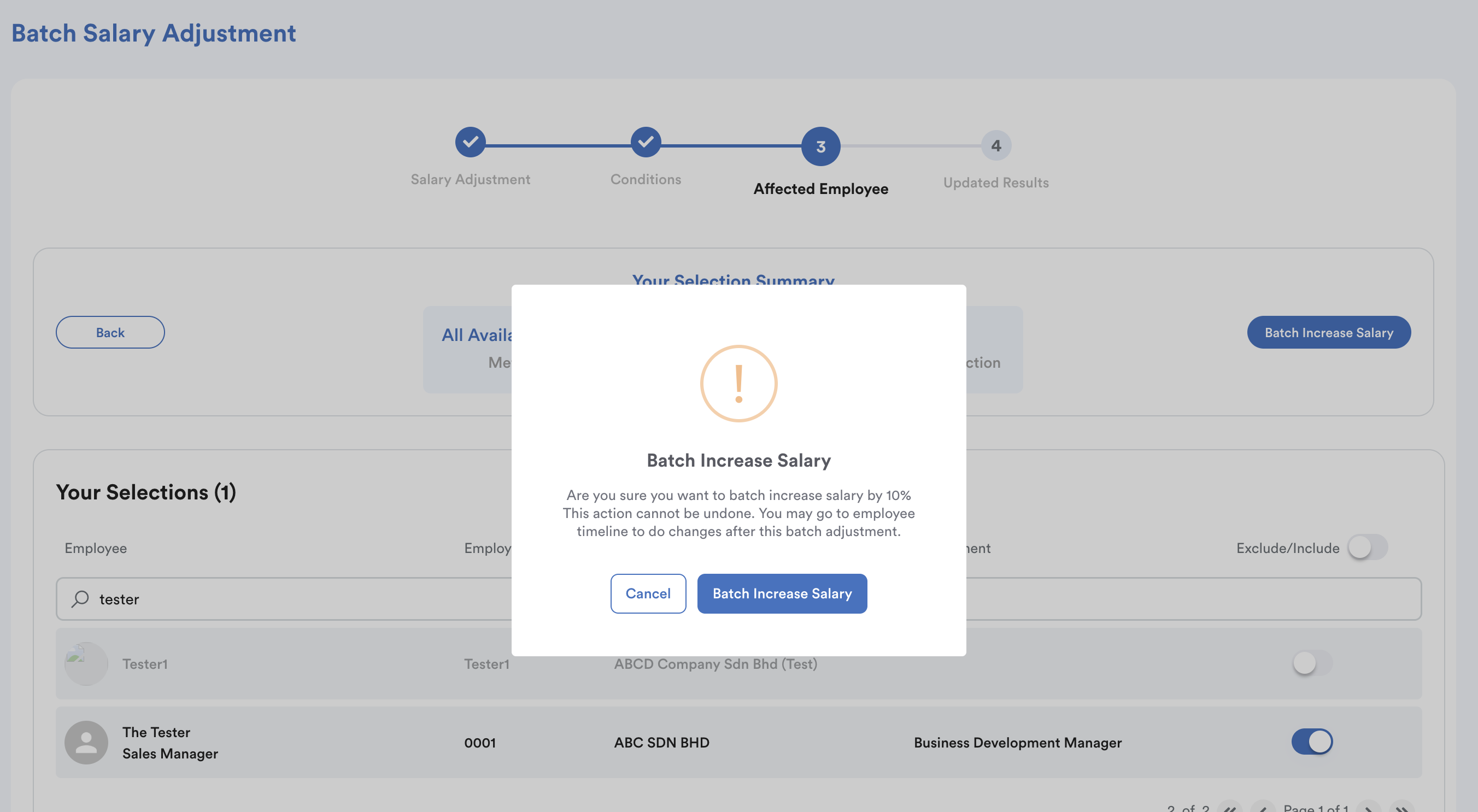 Once clicked, you will see a pop-up message as shown below. To further confirm the changes made, click Batch Increase Salary.