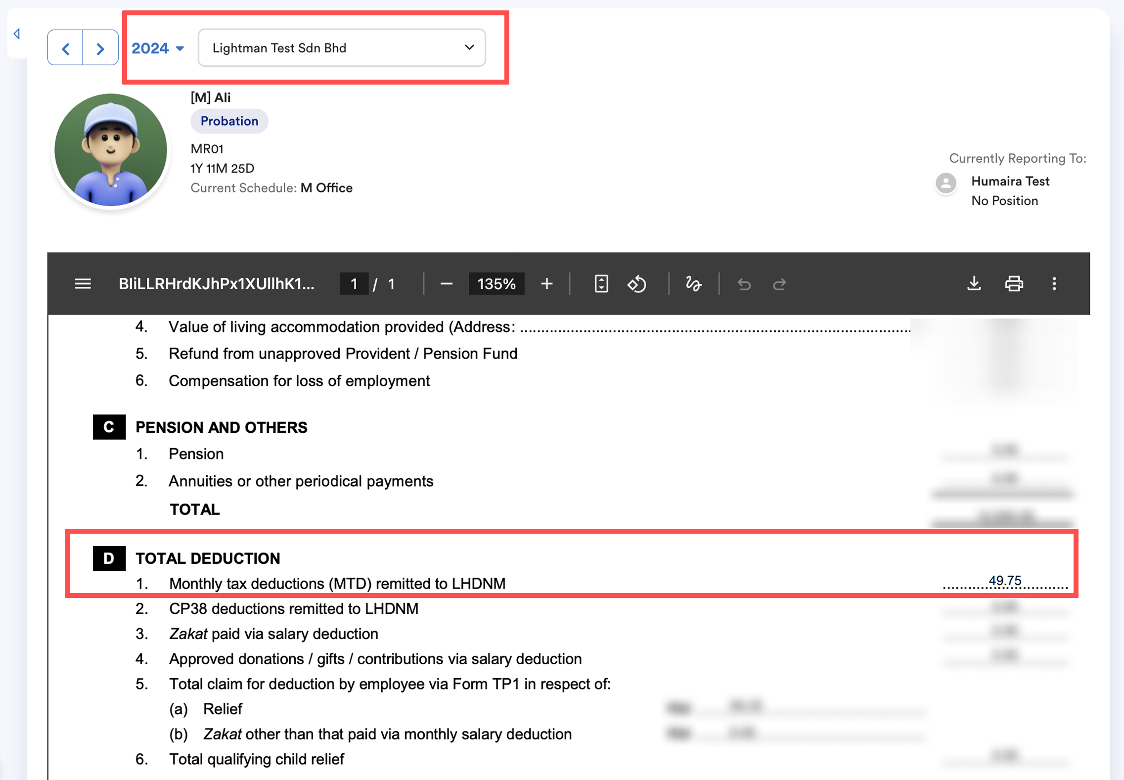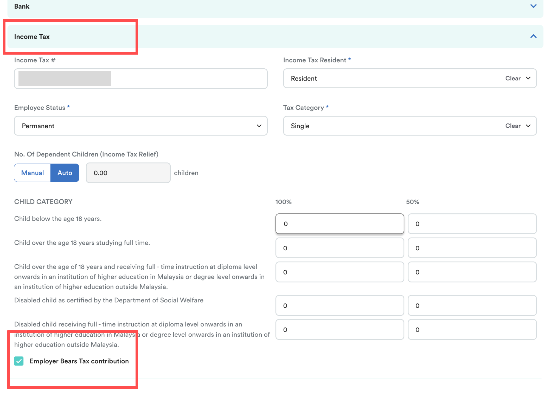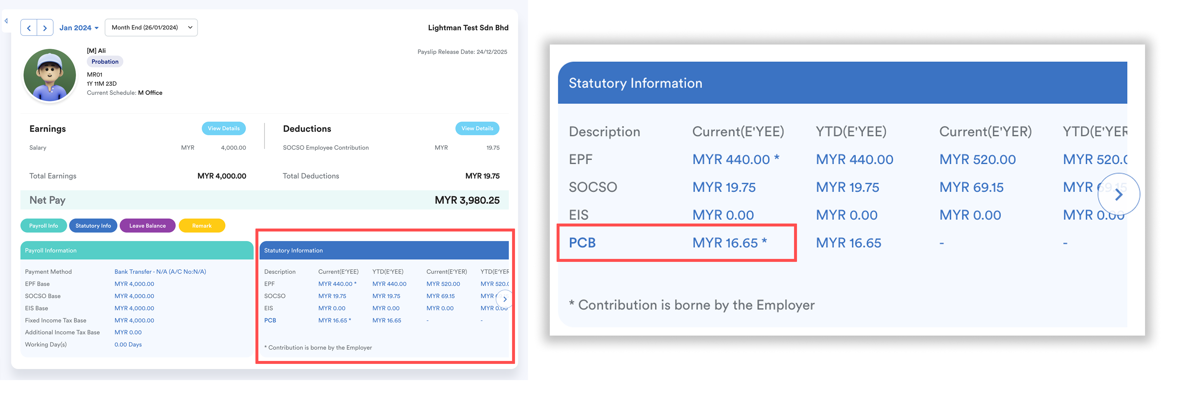 When the Employer Bears Tax Contribution option is enabled, the system treats the PCB as paid by the employer instead of being deducted from the employee’s salary.