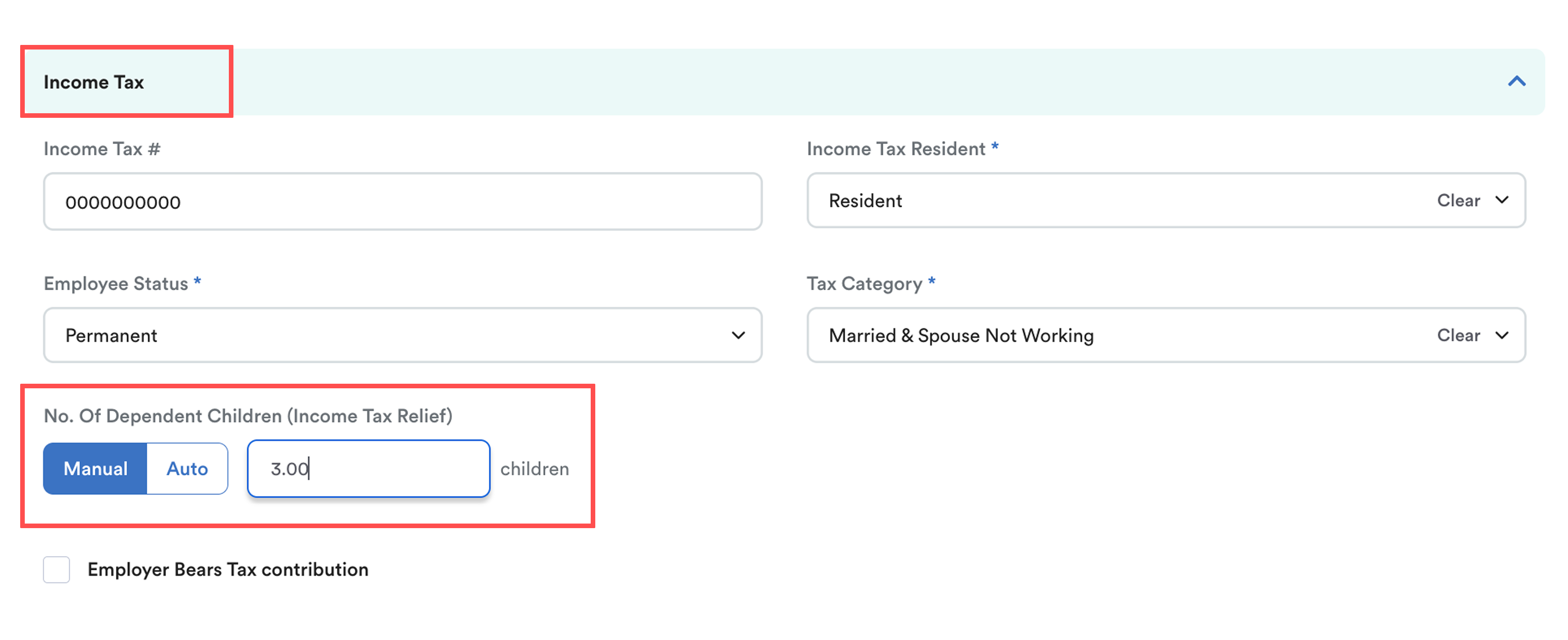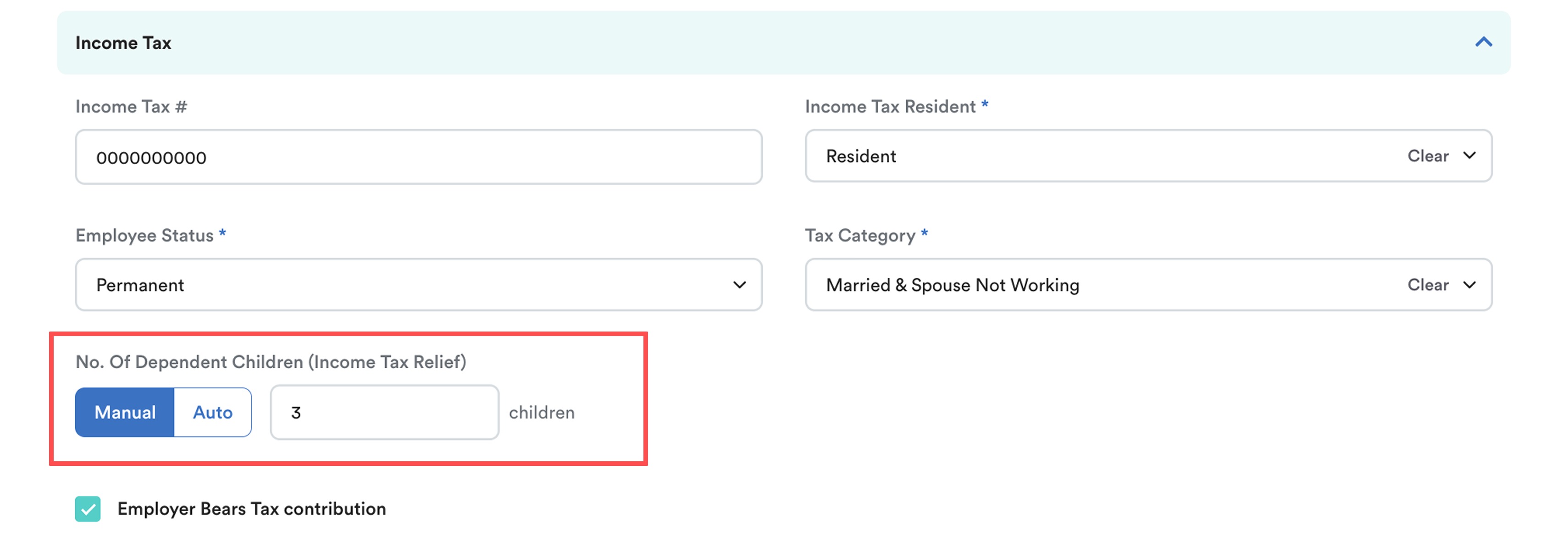 In the Employee Profile > Income Tax section, you’ll see the Number of Dependent Children (Income Tax Relief) field with two options: Manual and Auto. Each option is used for different situations.