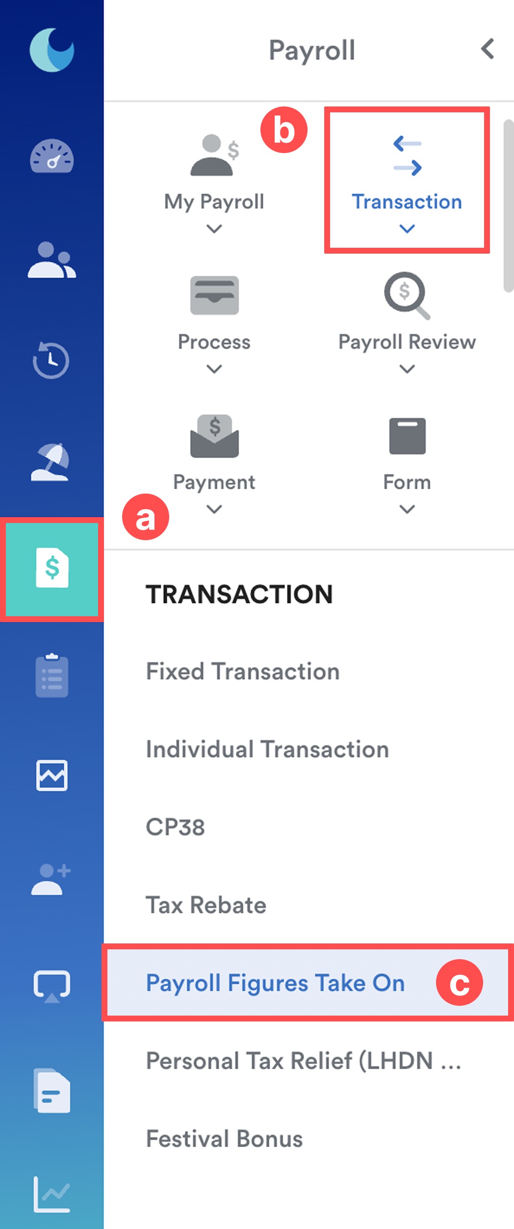 To view the calculated amount, go to Payroll (a) > Transaction (b) > Payroll Figures Take On (c).