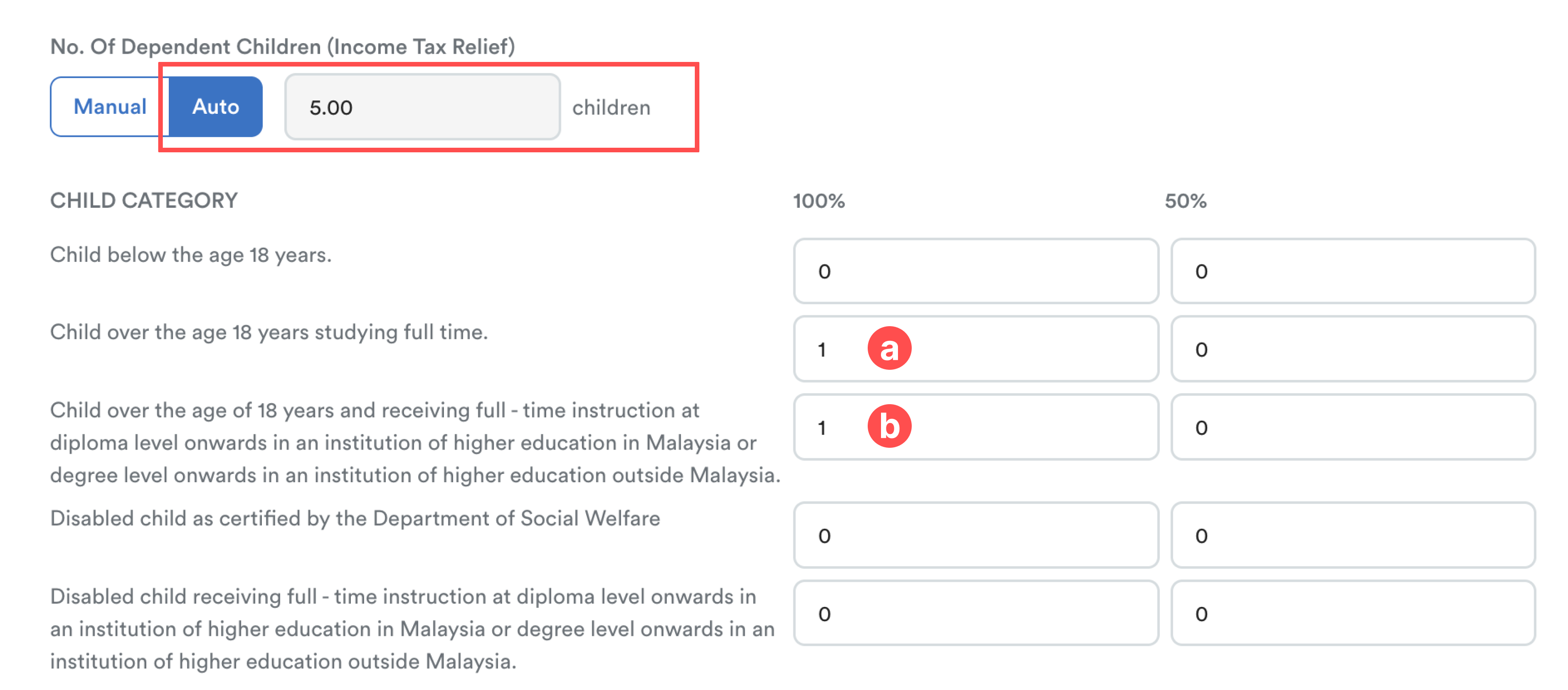 In Auto mode, the Total Children column reflects Equivalent Child Count for tax calculation purposes, not the actual number of children. Each child’s tax relief is converted into units based on RM 2,000 per child.