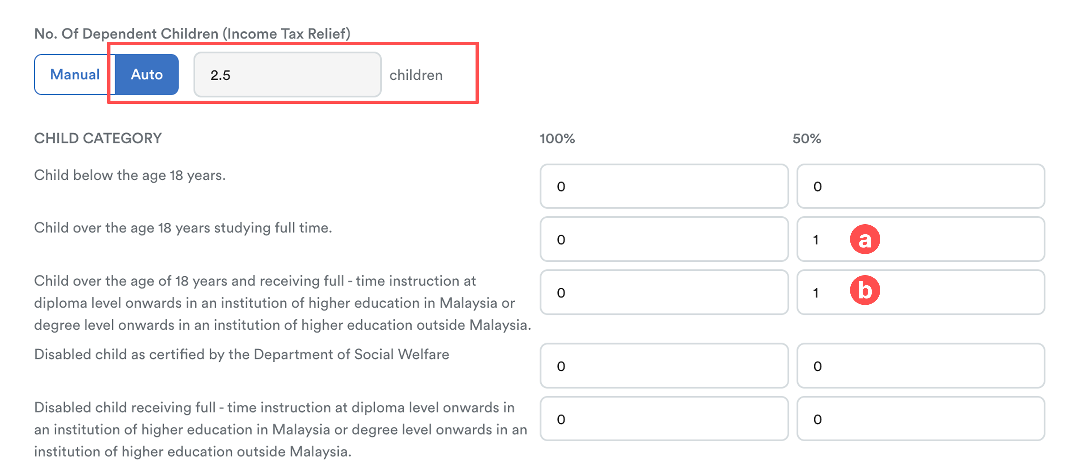 For these cases, the child relief calculation is fixed and straightforward, so you can directly enter the number of children without further categorisation.