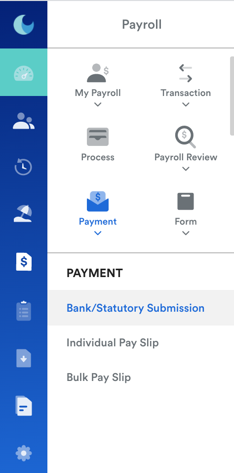 On your left menu, go to Payroll, click on Payment, and then click on Bank/Statutory Submission.