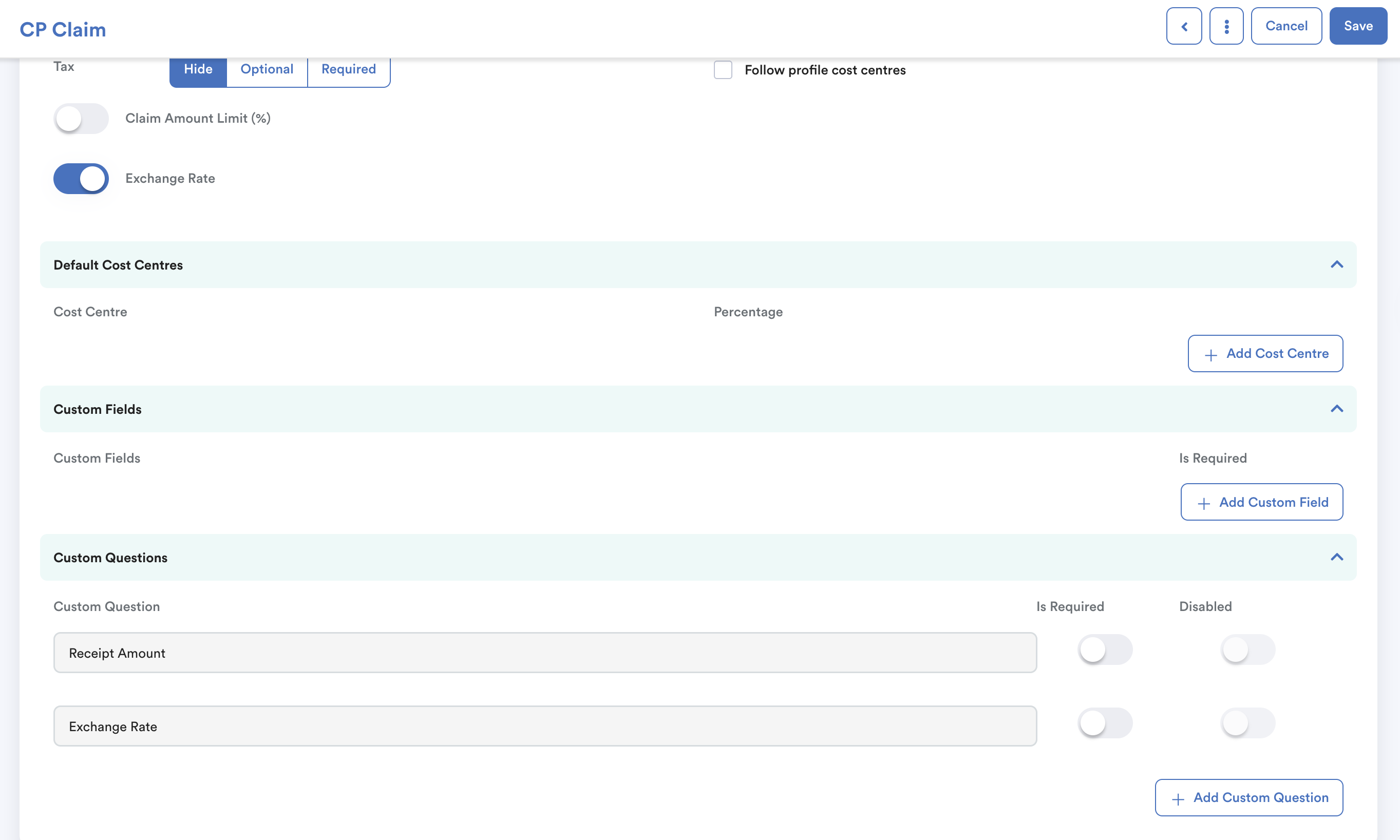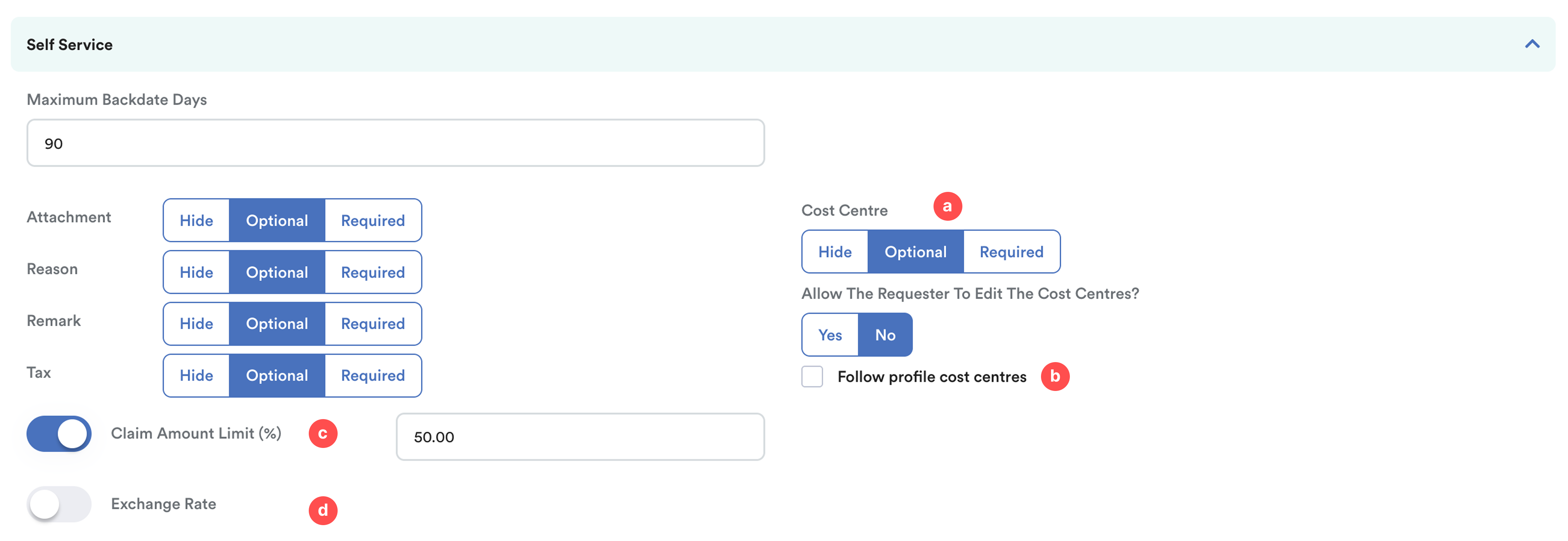 (c) Claim Amount Limit (%) : If you toggle this on, "amount include Tax" will be disabled during the request and calculate it based on % set in the amount limit multiplied by Receipt Amount. And requestor needs to fill in "Receipt Amount".
