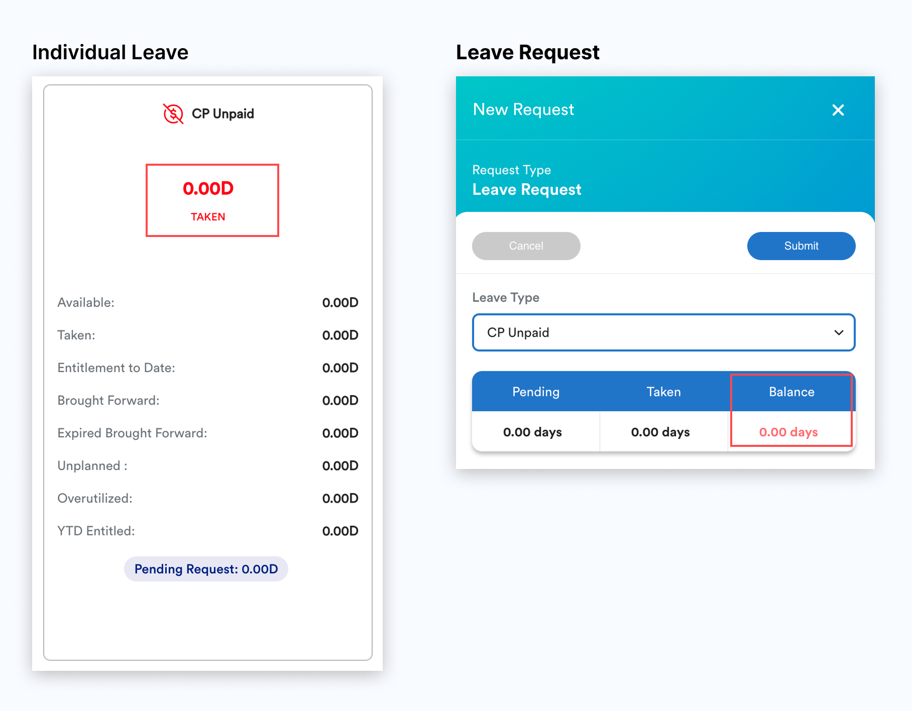 Note: Unpaid leave works differently from leave types; unpaid leave has no leave balance or entitlement, so you will see zero leave balance.