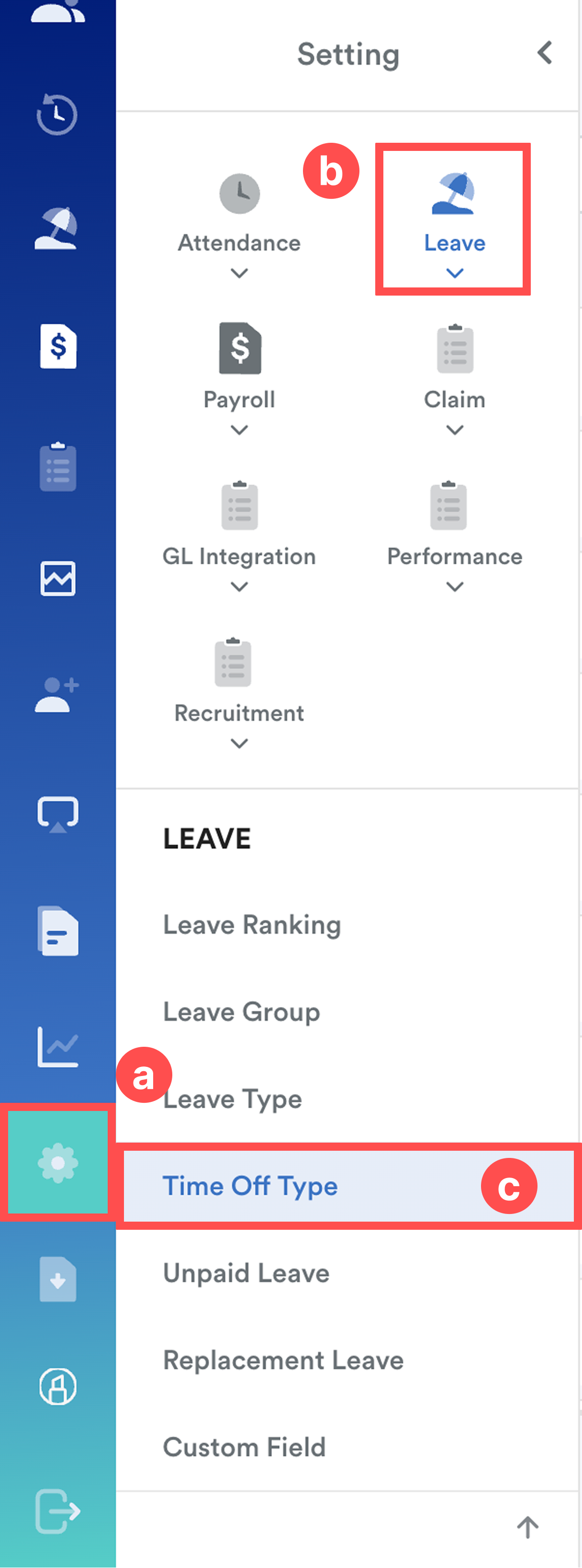 On the left menu, go to Settings (a) > Leave (b) > Time off Type (c).