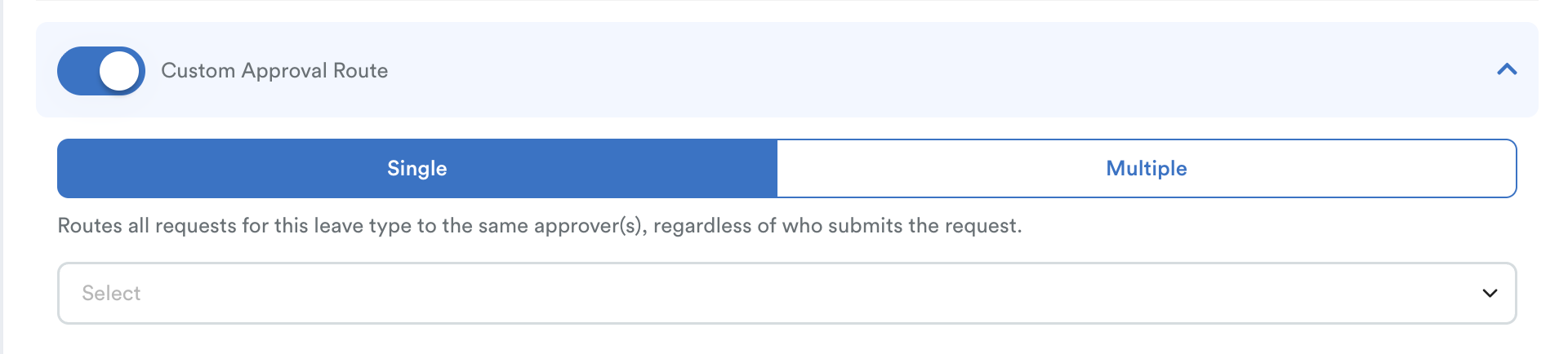 Custom Approval Route - When toggled on, you can set custom approval flow by choosing a single or multiple custom route specific to this time off.