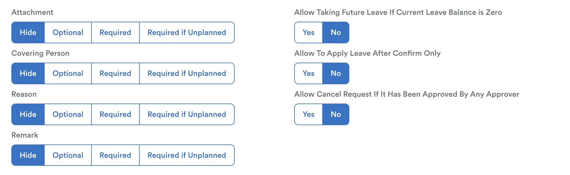 Select which fields appear on the leave application form, and set them as optional or mandatory.