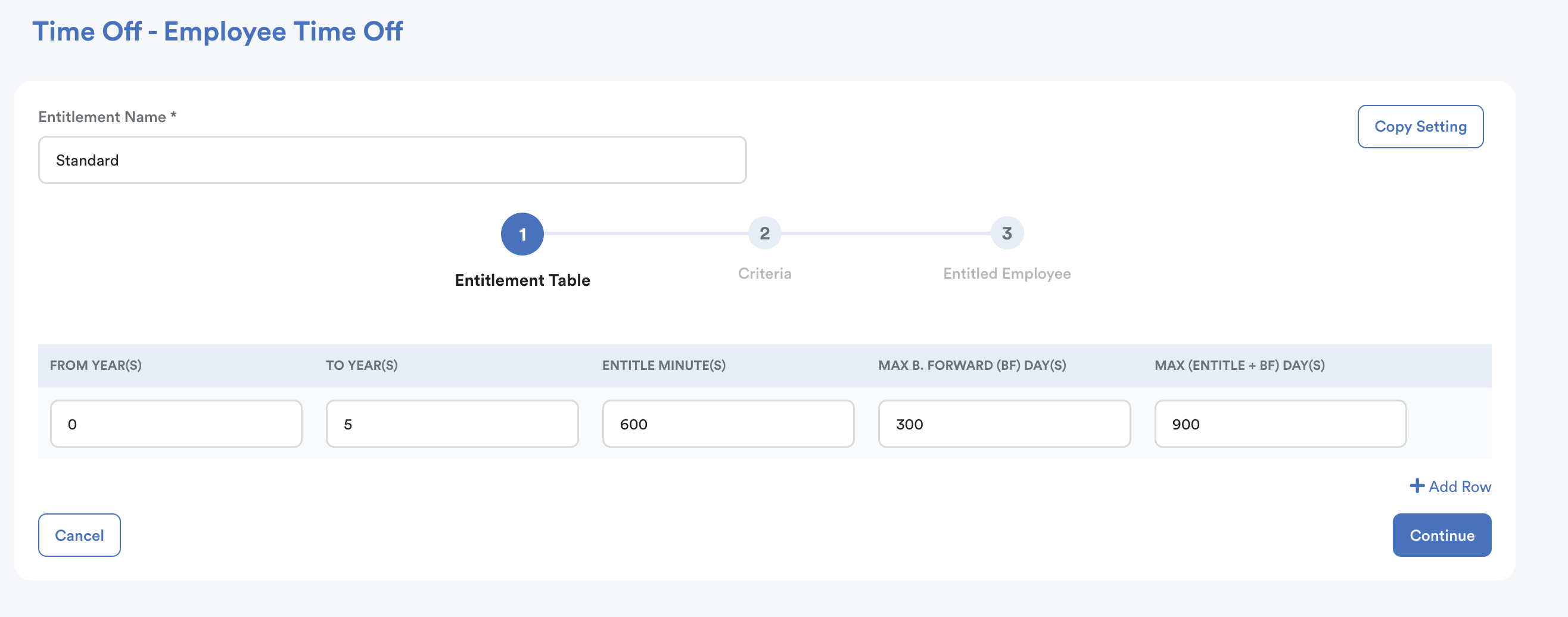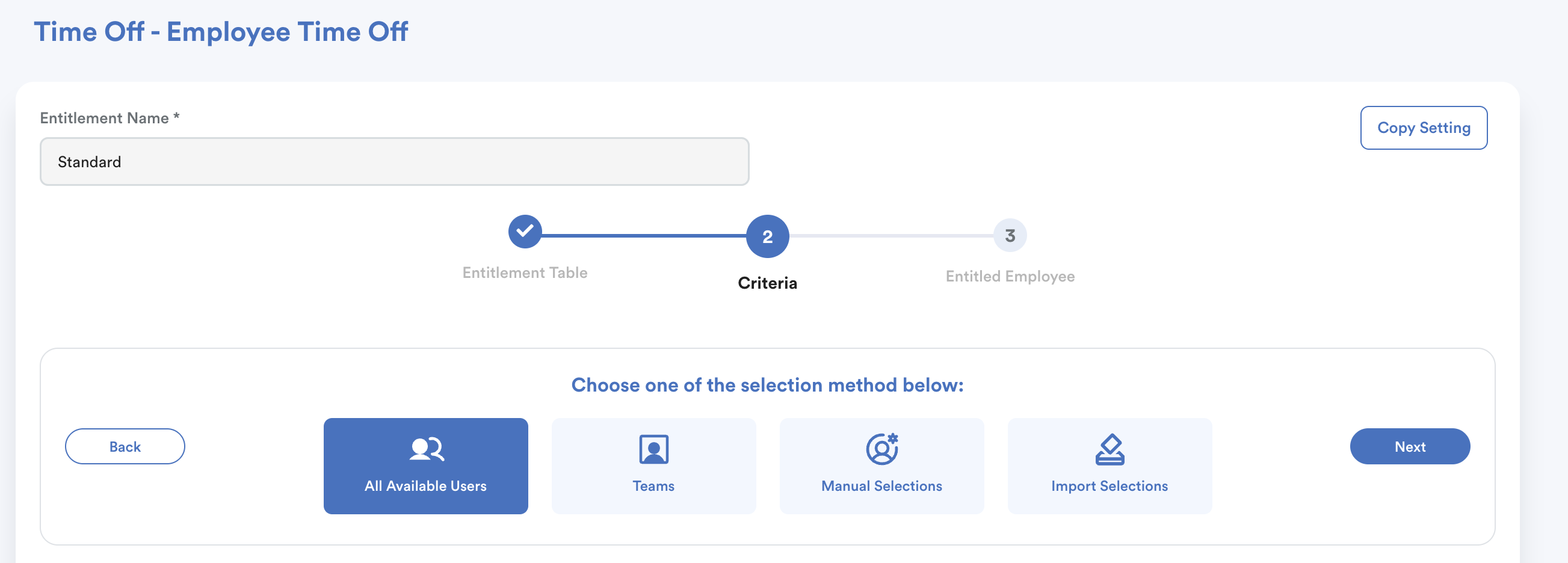 - Copy Setting: Use this to duplicate entitlement settings from another time off type.