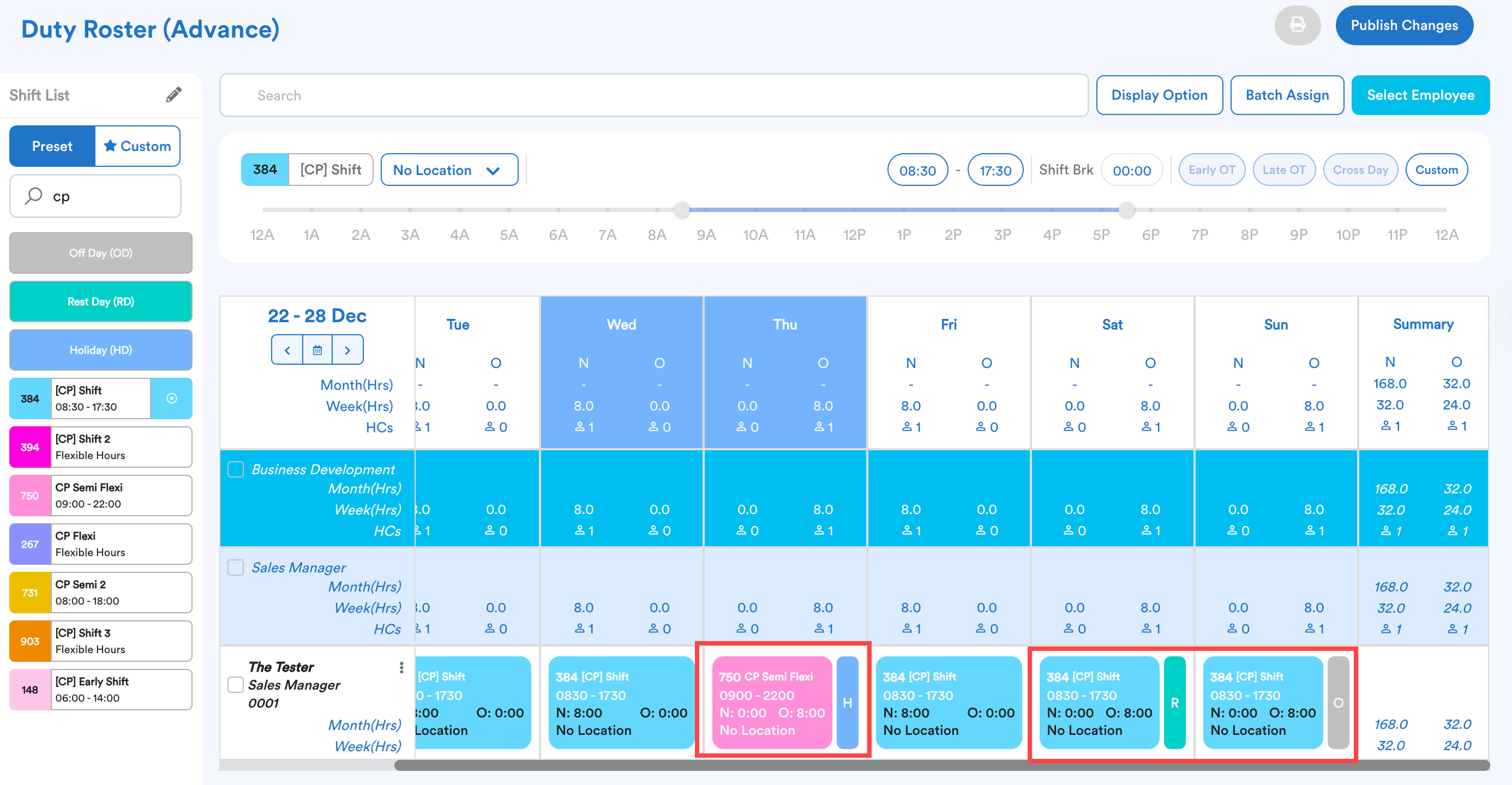 d) Now you can see the assigned shift for your selected staff (a). Click on the Publish Changes button on the top right of the page to save the changes you have made.