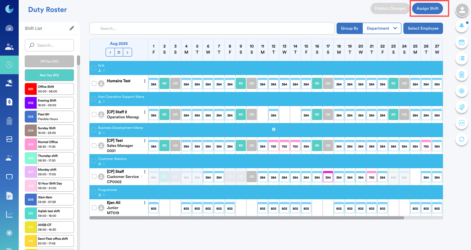 Once clicked, the Duty Roster page will be displayed below. Click on the Assign Shift on the top right of the page.
