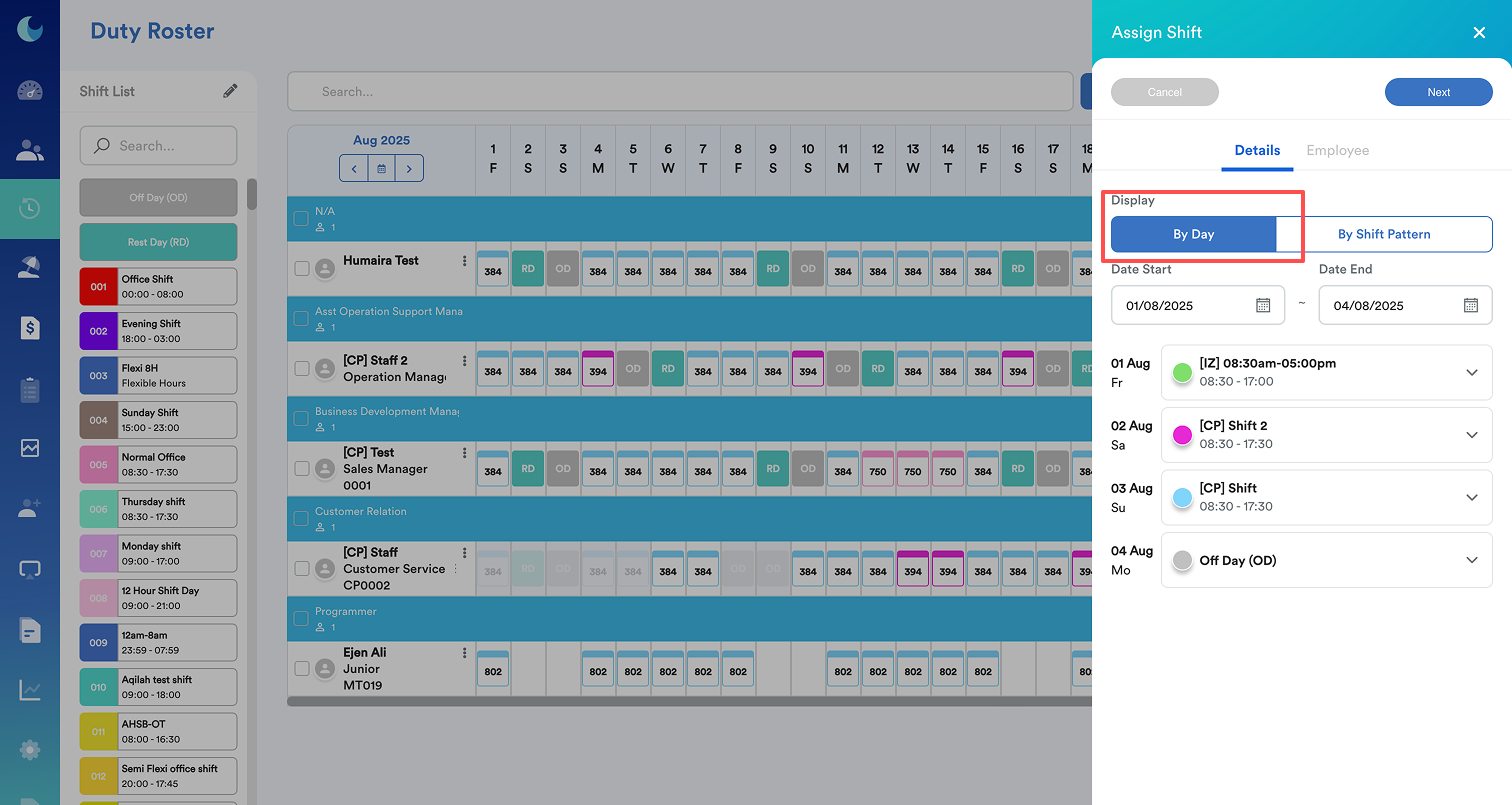 b) Choose the shifts from the drop-down list to be assigned for those specific dates. Then, click Next. In this case, I chose 1 Aug to 4 Aug 2025.