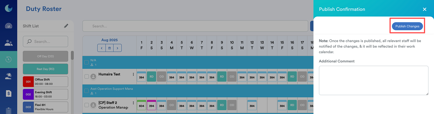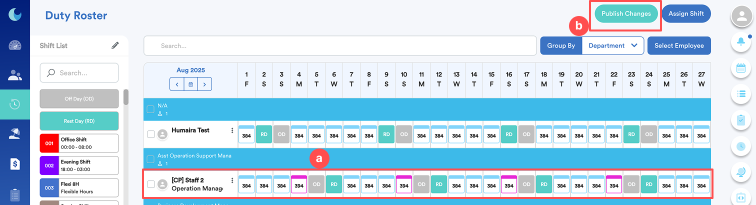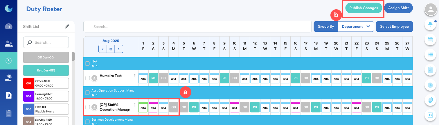 d) Now you can see the assigned shift for your selected staff (a). Click on the Publish Changes button on the top right of the page to save the changes you have made.