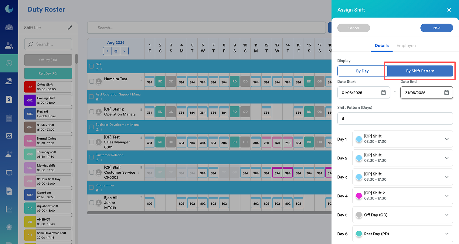 a) Choose the number of days that you want the shift to be repeated in the Shift Pattern Days. In this example, 6 days are selected, so the same shift pattern will repeat throughout August 2025.