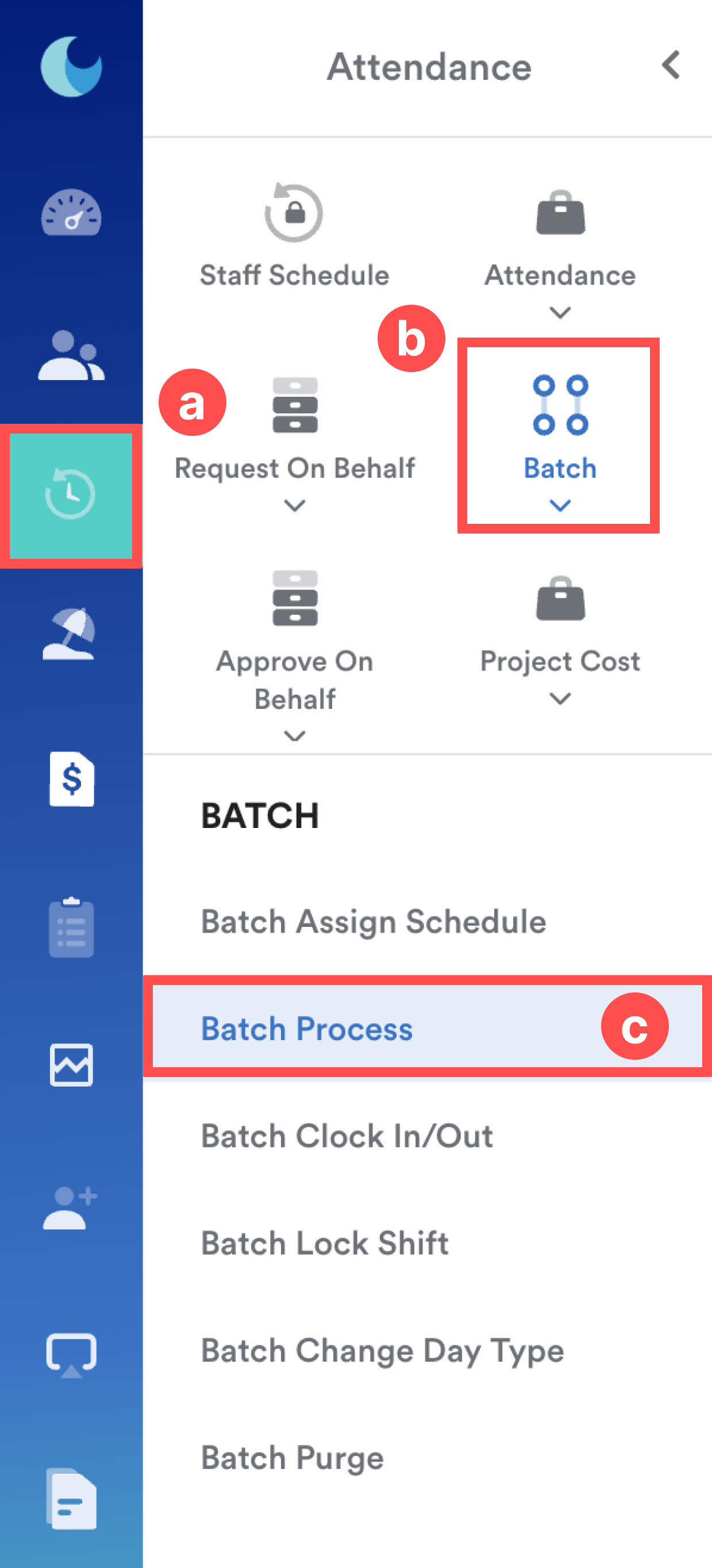 On the left menu, go to Attendance (a) > Batch (b) > Batch Process (c).