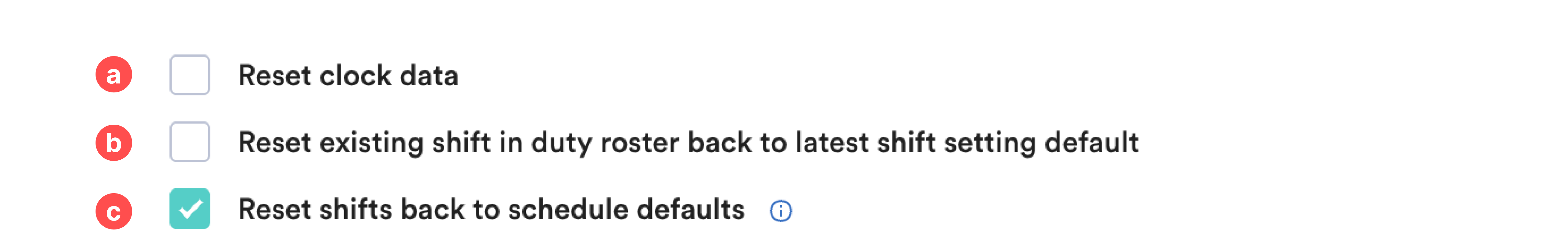 Note: If you select this option, all shifts assigned through the Duty Roster will be cleared and reverted to the default schedule settings. Do not choose this option if you do not intend to remove shifts assigned by the Duty Roster.
