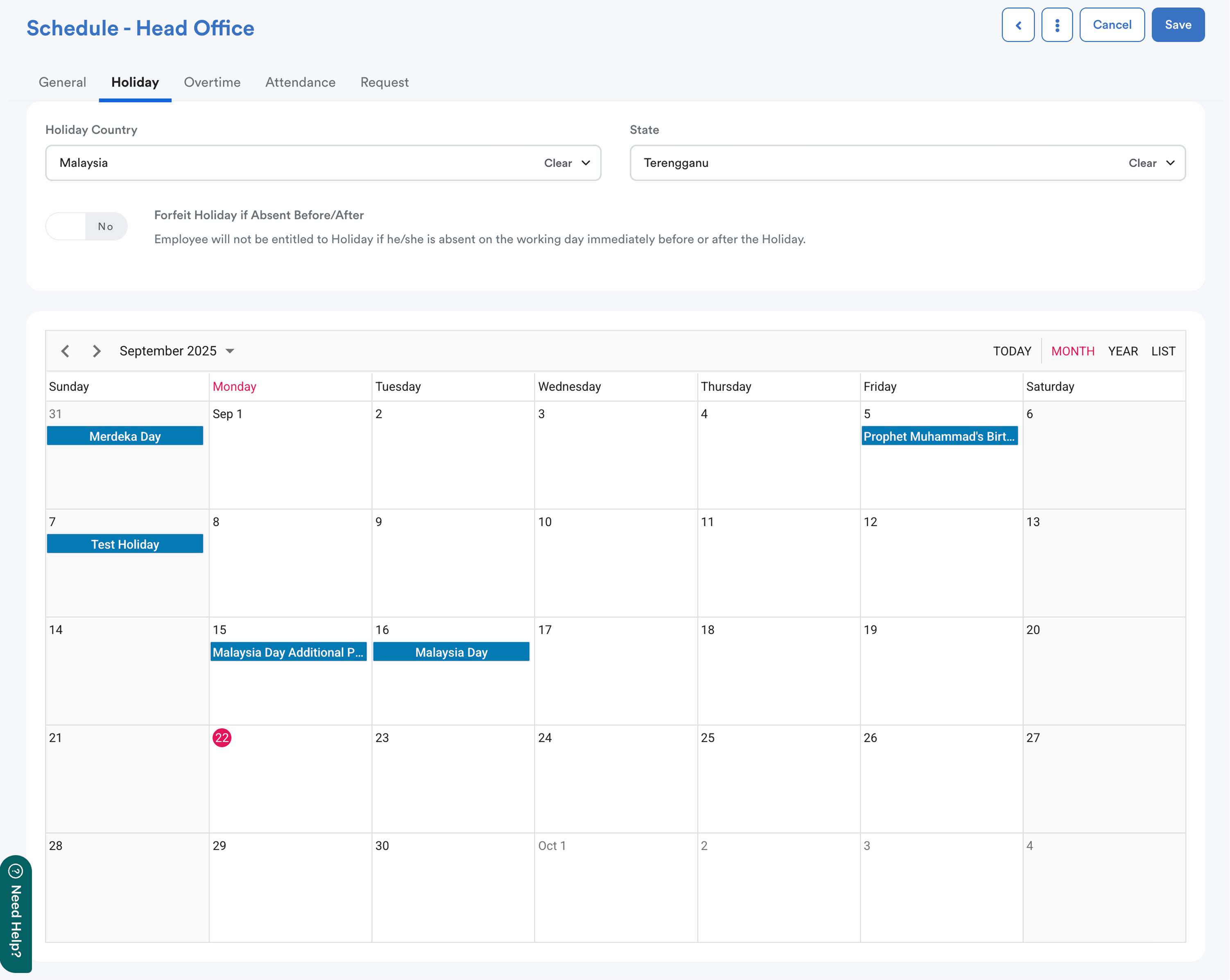 - Holiday: Manage public or additional holidays linked to the schedule.