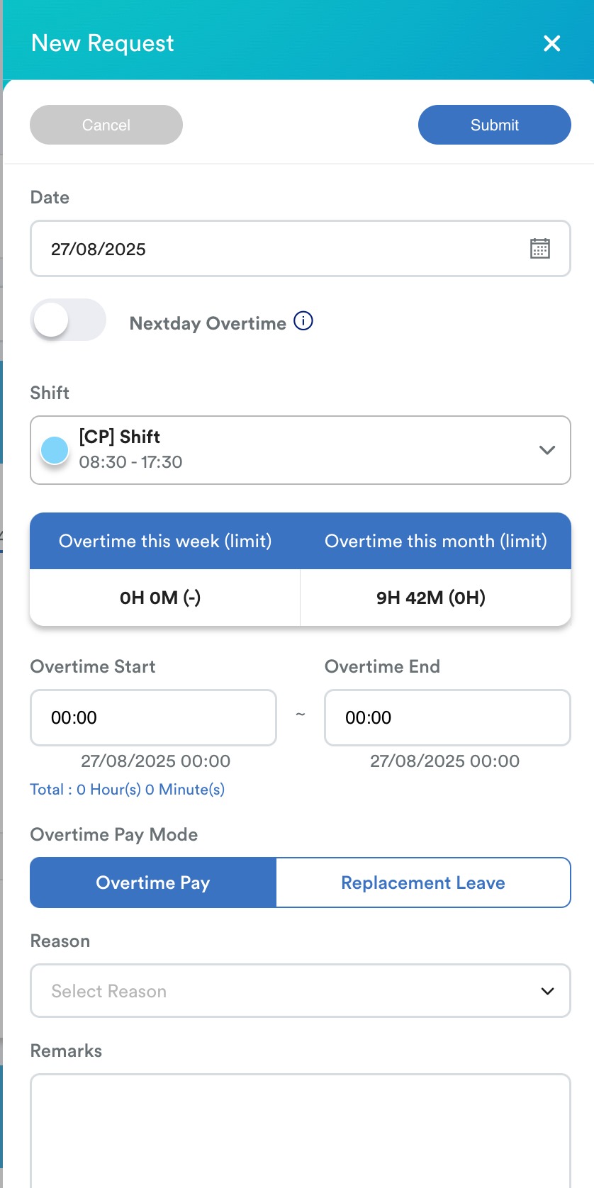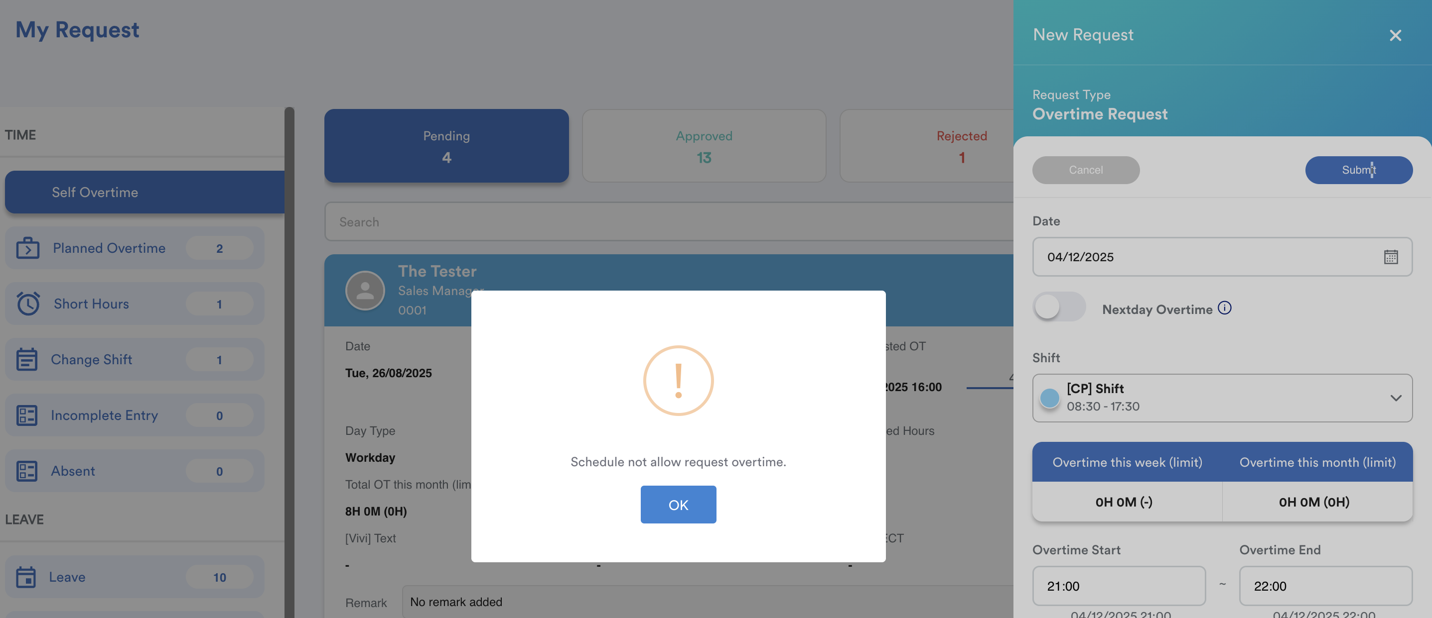 Current system do not allow overlapping request. For example: If you have either work shift or pre-approved OT, you will not be able to submit overtime request.
