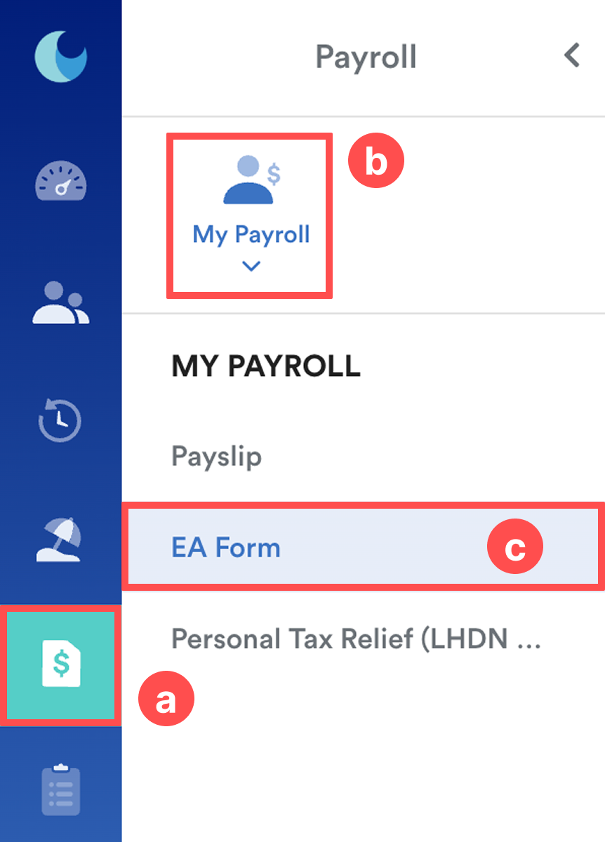 Navigate to Payroll (a) > My Payroll (b) > EA form (c).