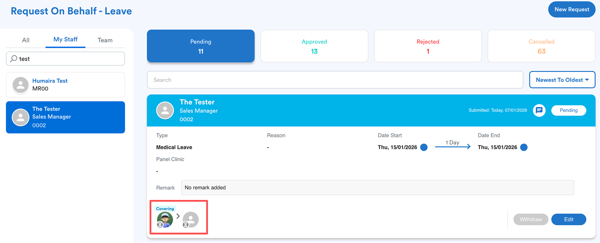 You can see that staff A requested a covering person in his leave request and subsequently added in the approval workflow.