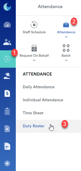 Under your left icon > Attendance System > Attendance > Duty Roster.