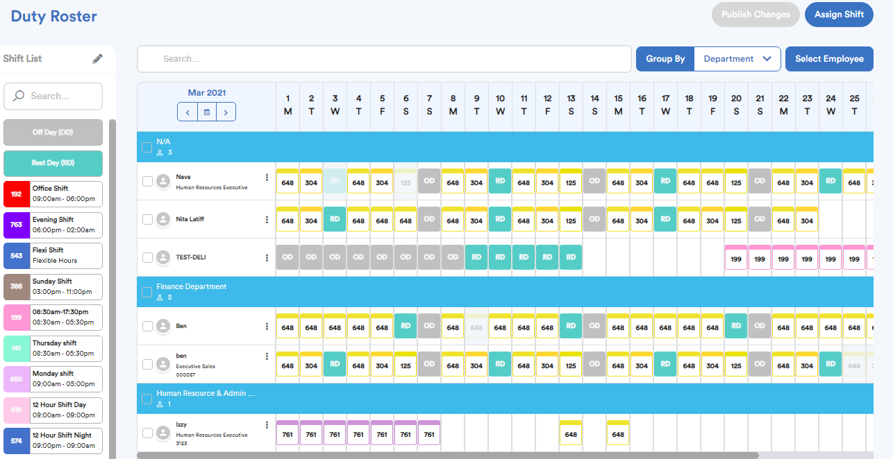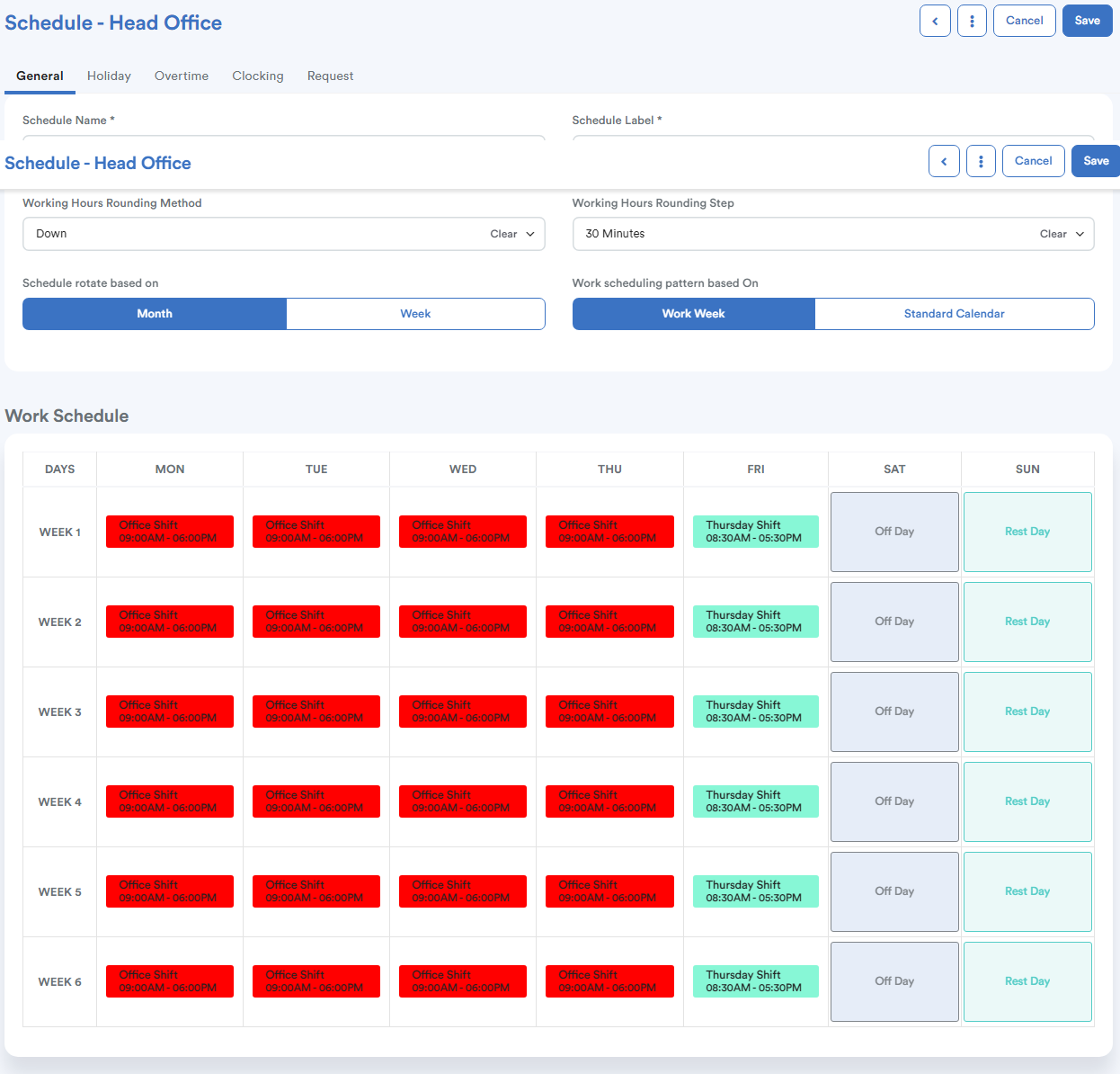 A rotation of shift patterns in a relatively wider period, ie. month or week. Setting includes work scheduling patterns based on work week or standard calendar. Default schedule setting assignment to an employee. This setting is under your left icon > Setting > Attendance > Schedule. The main difference between the Shift module and the Duty Roster module is that the Shift module is the default setting assigned to an employee whereas, under the Duty Roster module, you'll have a summary of the shift pattern for the said month which you can amend the shift assignment on an ad-hoc basis.