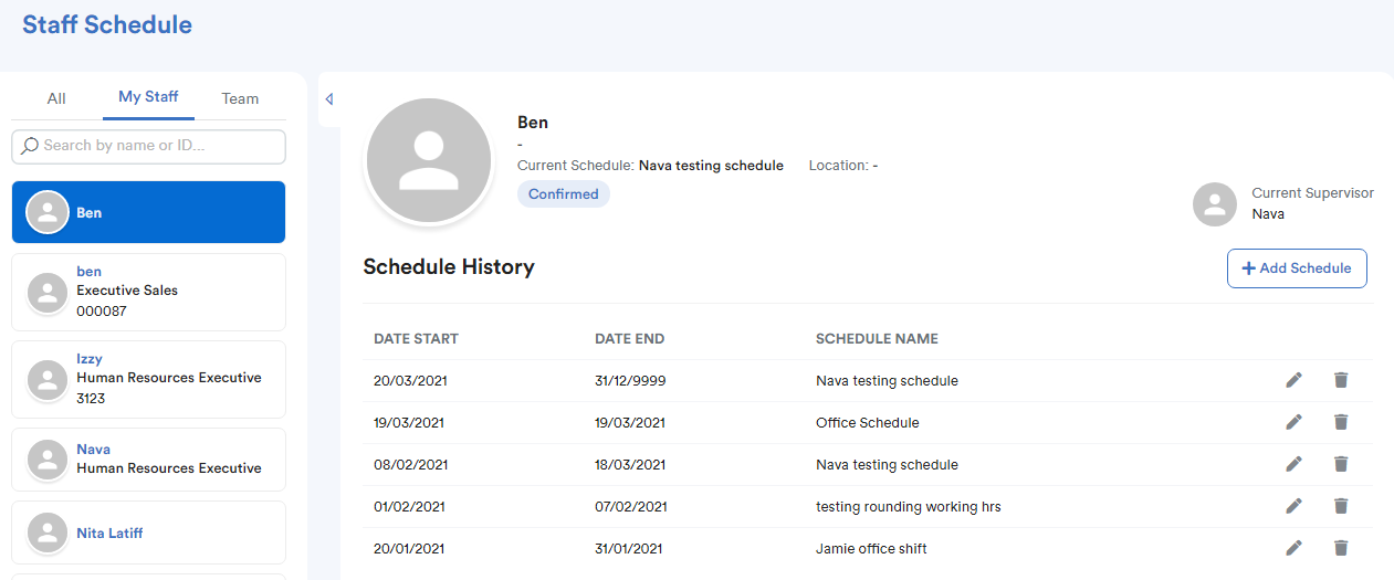 After the Schedule Setting, you can then assign it to an employee under your left icon > Attendance > Staff Schedule. Refer below to a sample of a staff schedule assigned to an employee. This will be the default schedule setting for an employee.