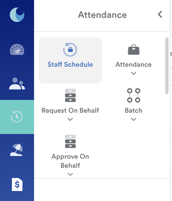 Schedule: Setting > Attendance > Schedule. Also under Attendance > Staff Schedule.