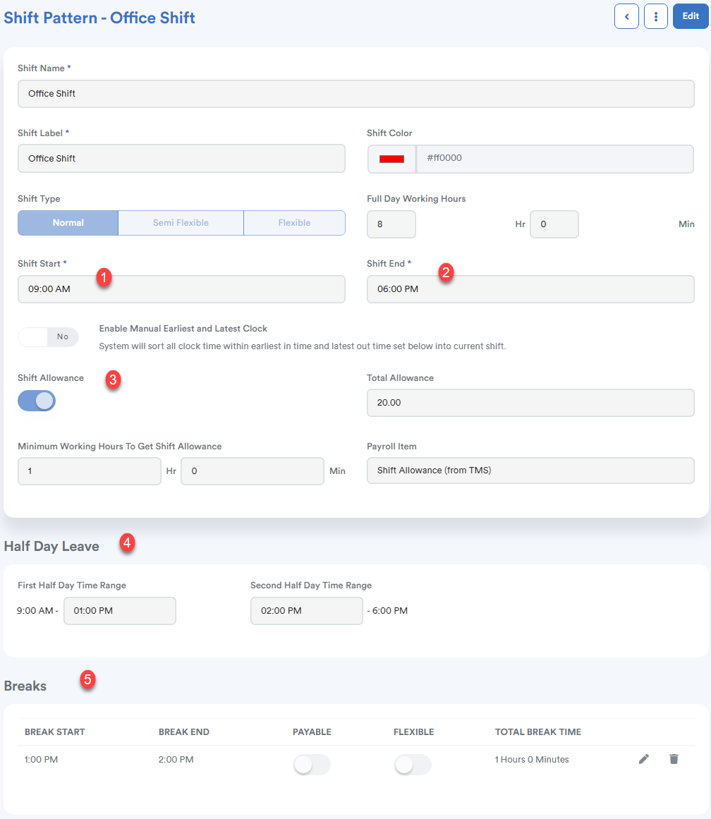 As shown in the screenshot below, this module captures the 1) start time, 2) end time, 3) shift allowance setting, 4) half-day, and 5) break time setting.