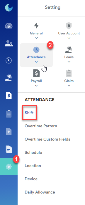 A daily work shift configuration setting that captures start time, end time, shift allowance setting, half-day, and break time setting. This setting is under your left icon > Setting > Attendance > Shift.