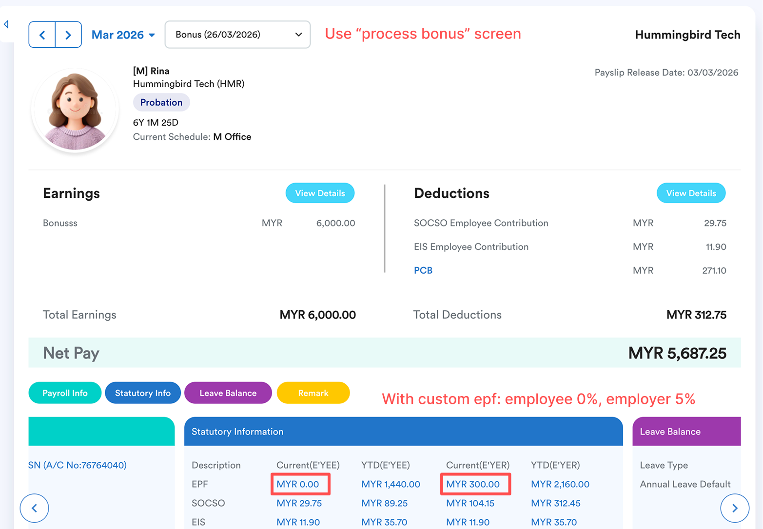 Note: If you set a custom epf on the employee profile, this custom amount will overwrite the default 13% contribution.