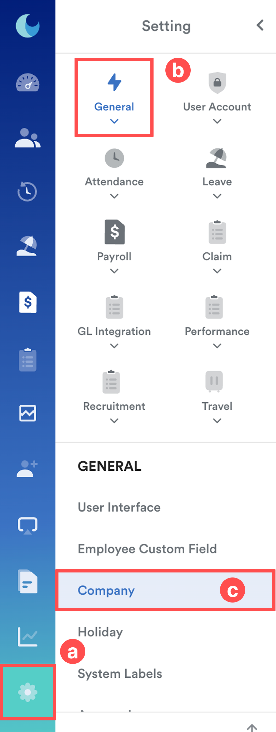 On the left menu, go to Settings (a) > General (b) > Company (c).