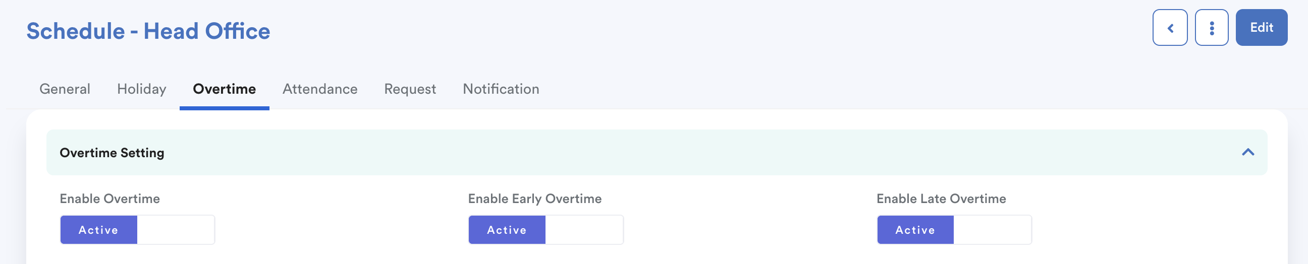 Path: Settings > Attendance > Schedule. Select the relevant schedule, and go to the Overtime tab.