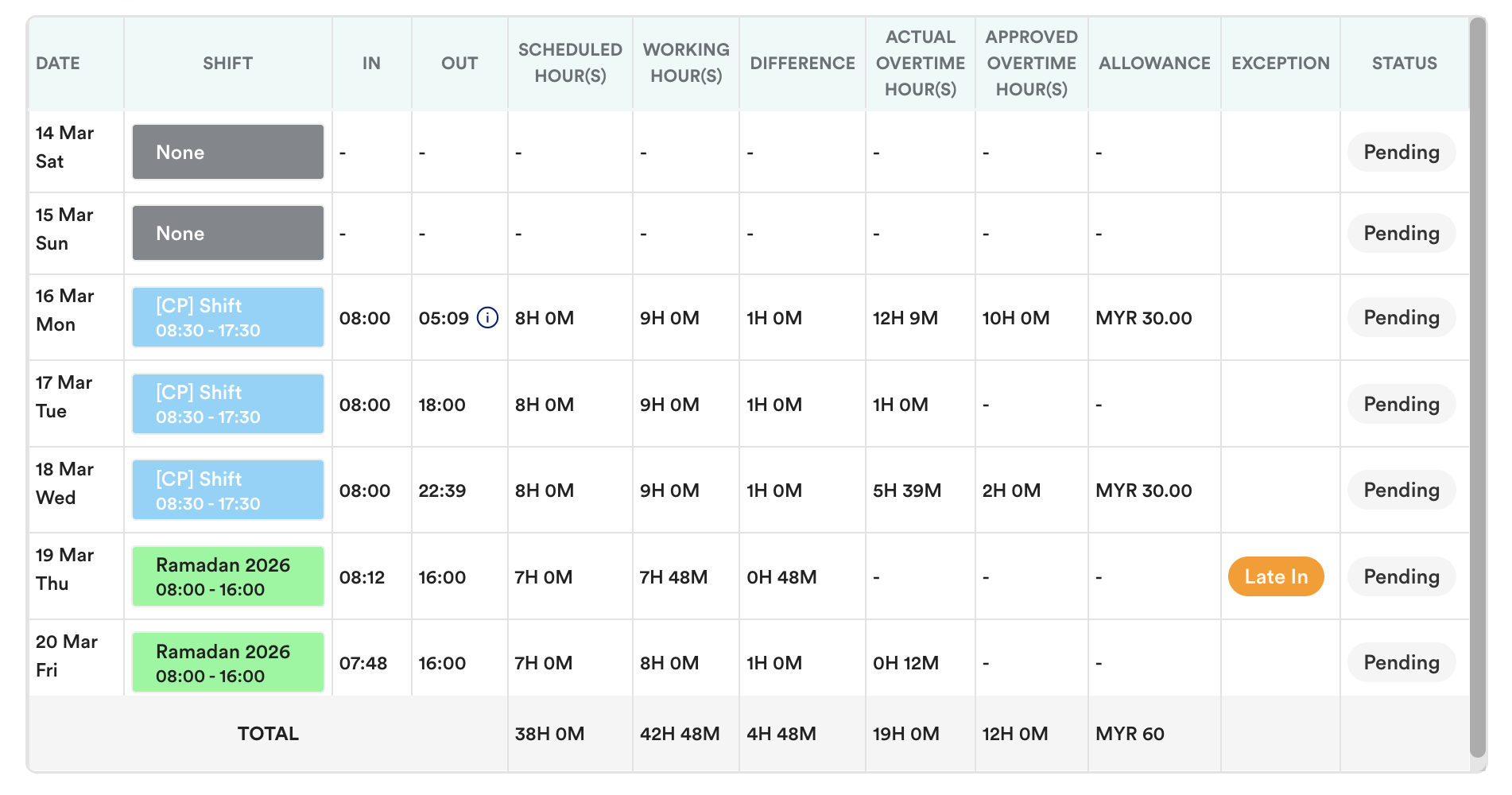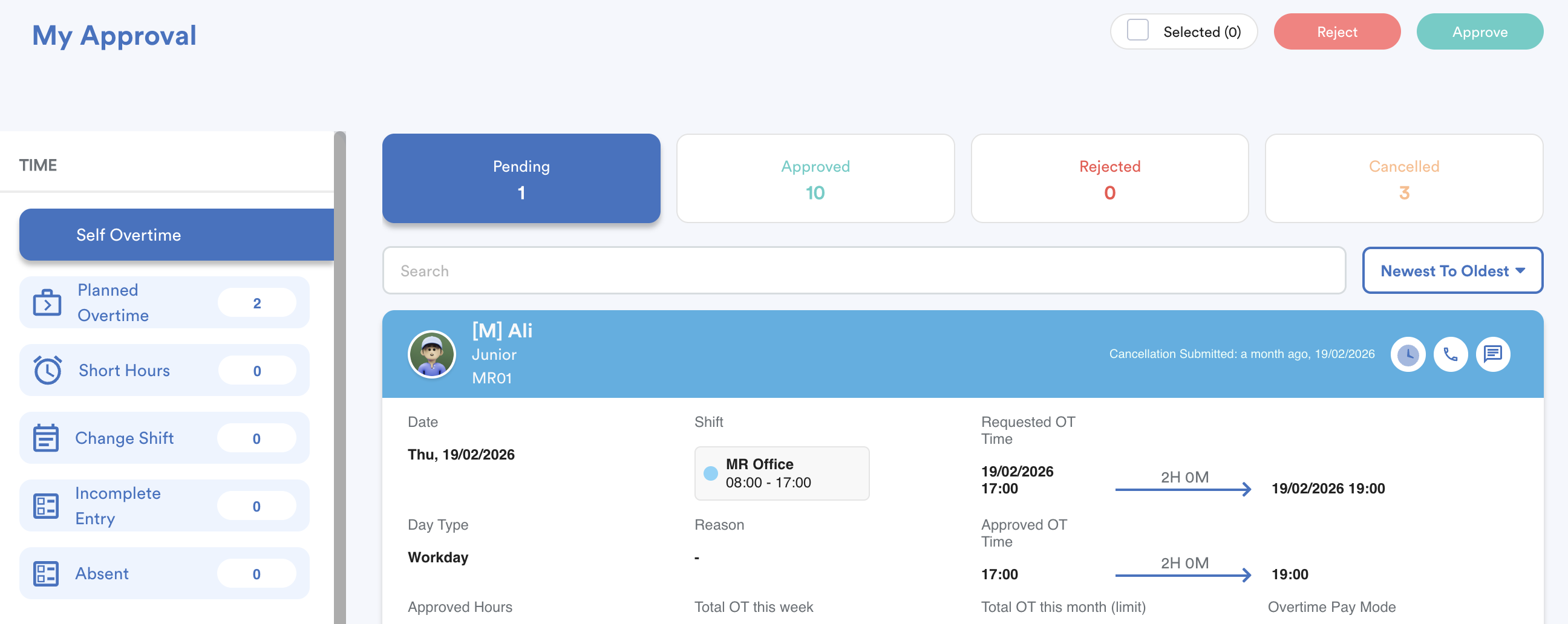 - If either the actual attendance record or the pre-approved OT request is missing, the system may return 0 approved OT hours