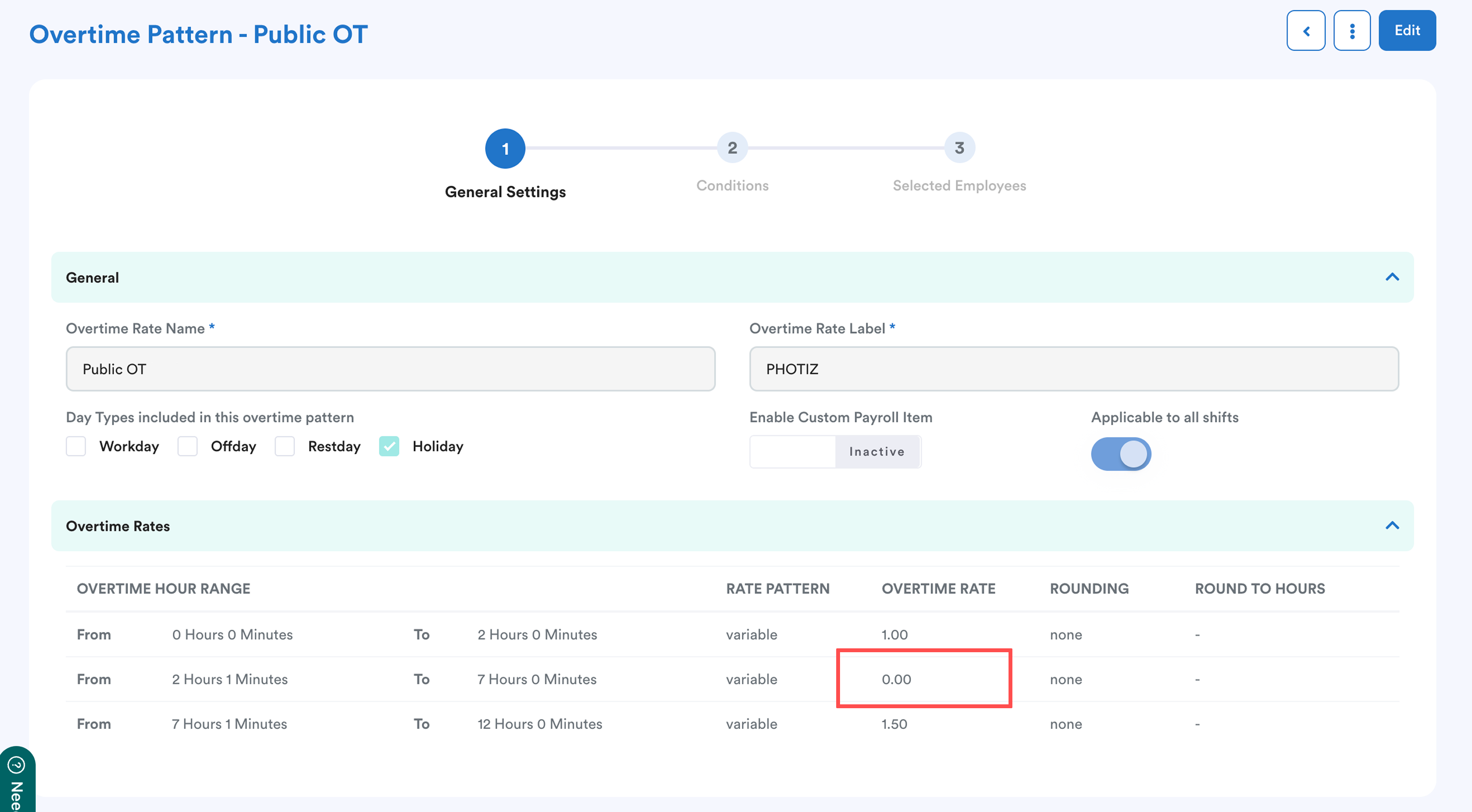 Path: Settings > Attendance > Overtime Pattern > Overtime Rates