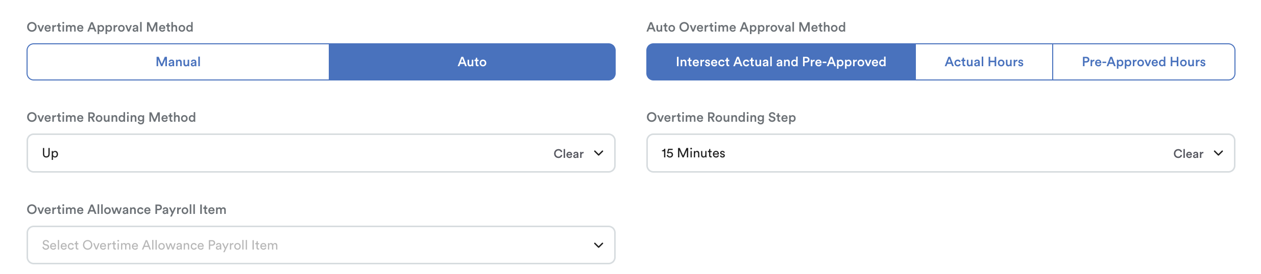 - Auto Overtime Approval Method Is Set to “Intersect Actual and Pre-Approved”