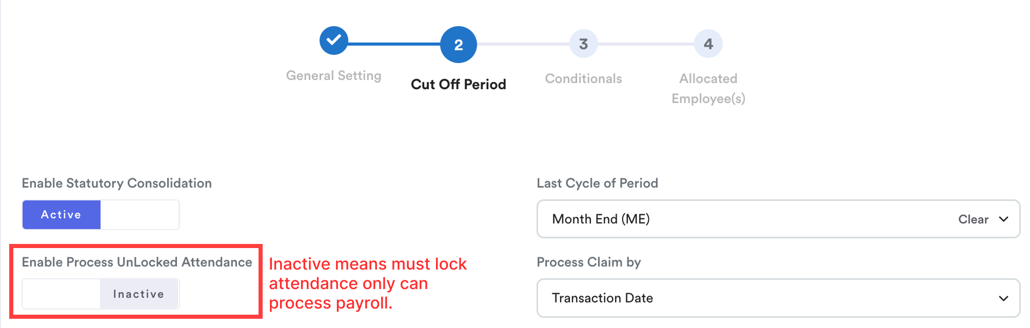 If the setting in payroll policy > Cut Off > "Enable Process Unlocked Attendance" is Inactive, you need to lock the attendance to process payroll.