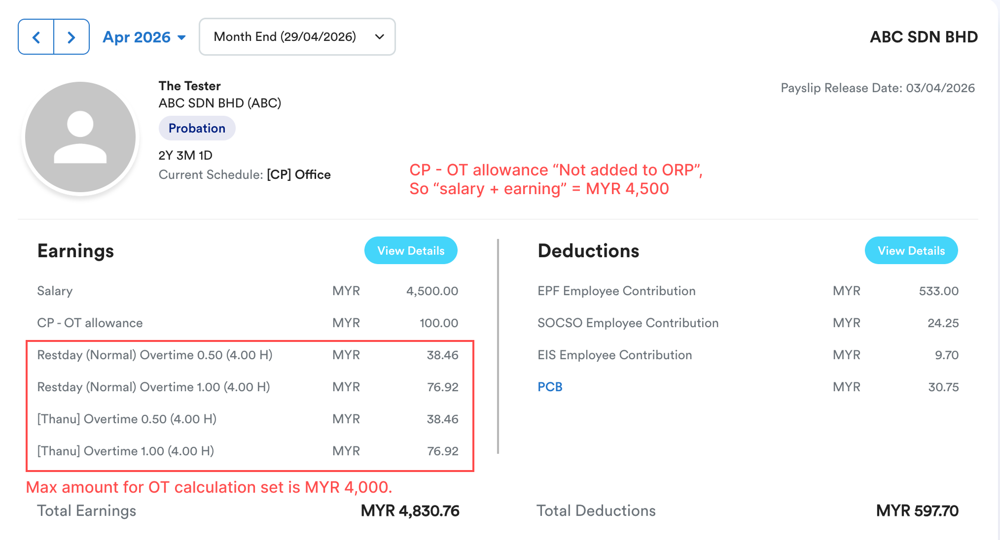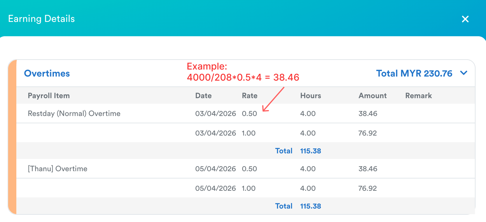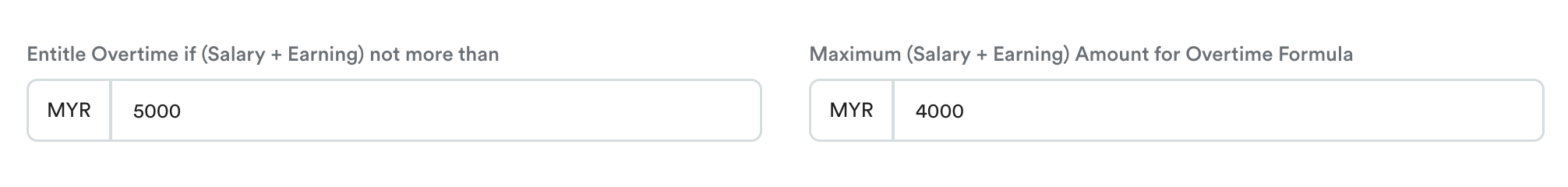 2. Even though this employee "Salary + Earning" is MYR 4,500, the maximum amount used for the overtime formula is MYR 4,000.