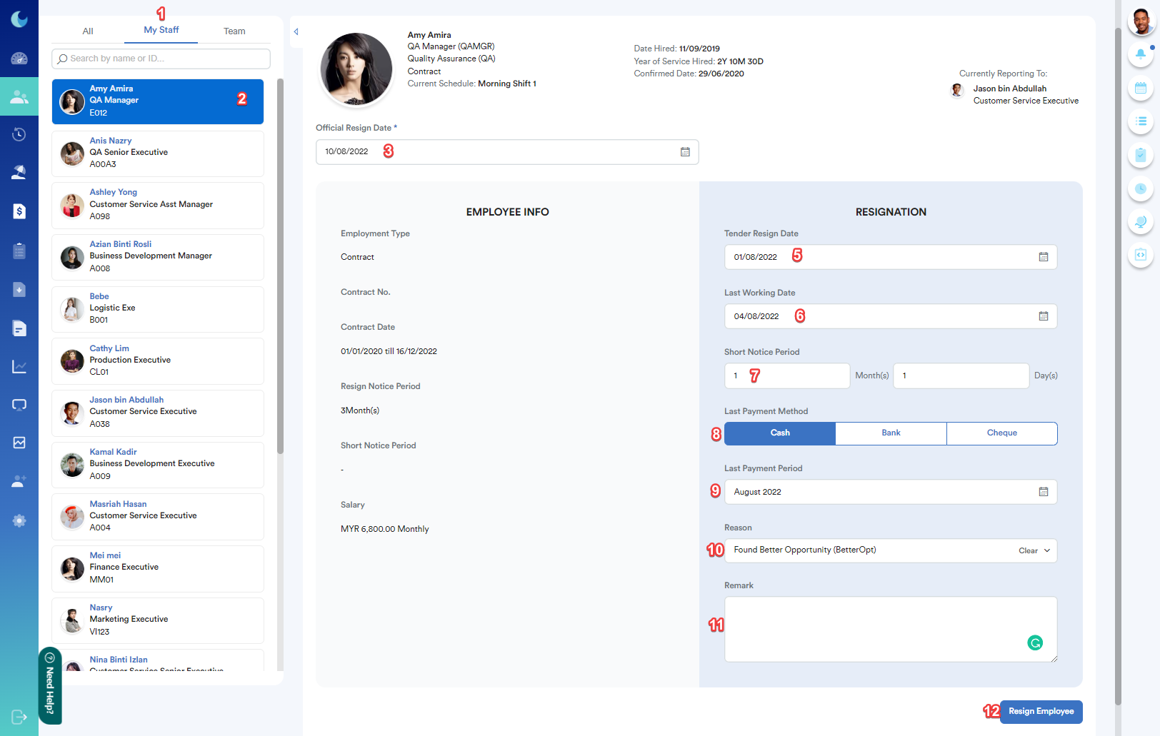 Once you have completed the available fields, click on resign (12) to finalize the resignation process. The status of this employee will change depending on the official resignation date (3).
