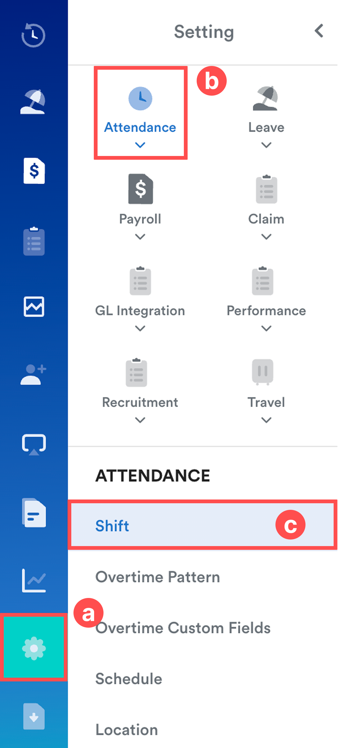 On the left menu, go to Settings (a) > Attendance (b) > Shift (c). Select relevant shift from the list to edit.