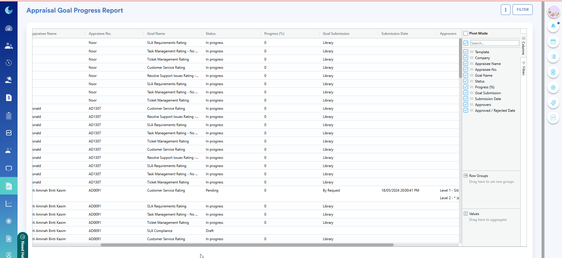 HR who wants to view the appraisee's goal status whether it has been created, submitted, completed or approved by Appraiser can generate the Appraisal Goal Progress Report.