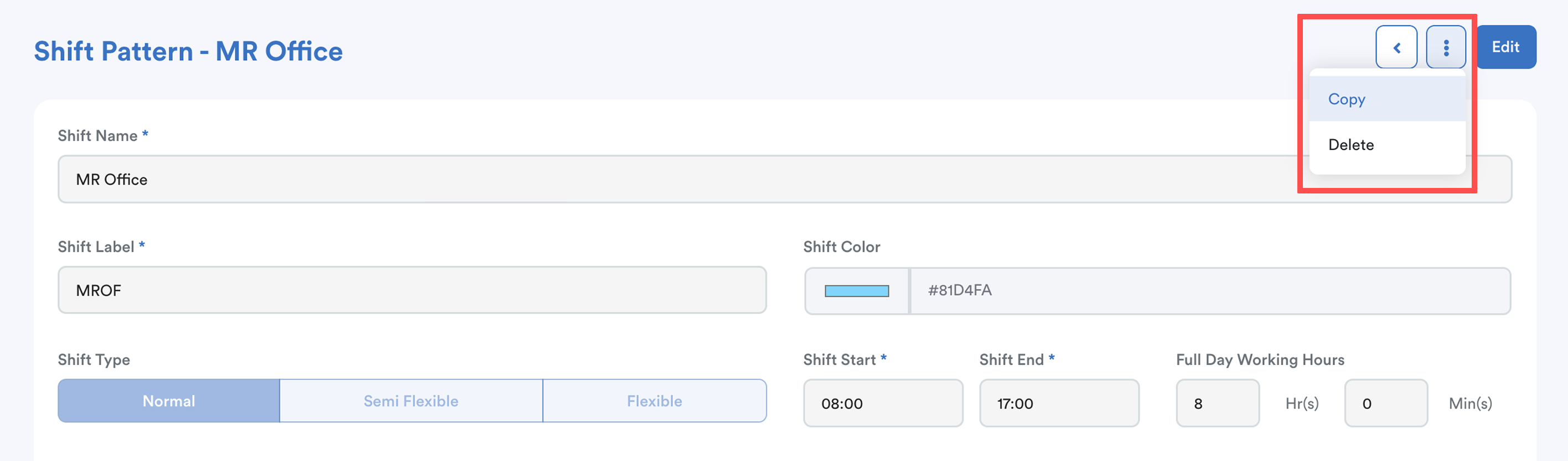 - Copy the existing shift. This preserves Overtime, Holiday and Attendance settings.