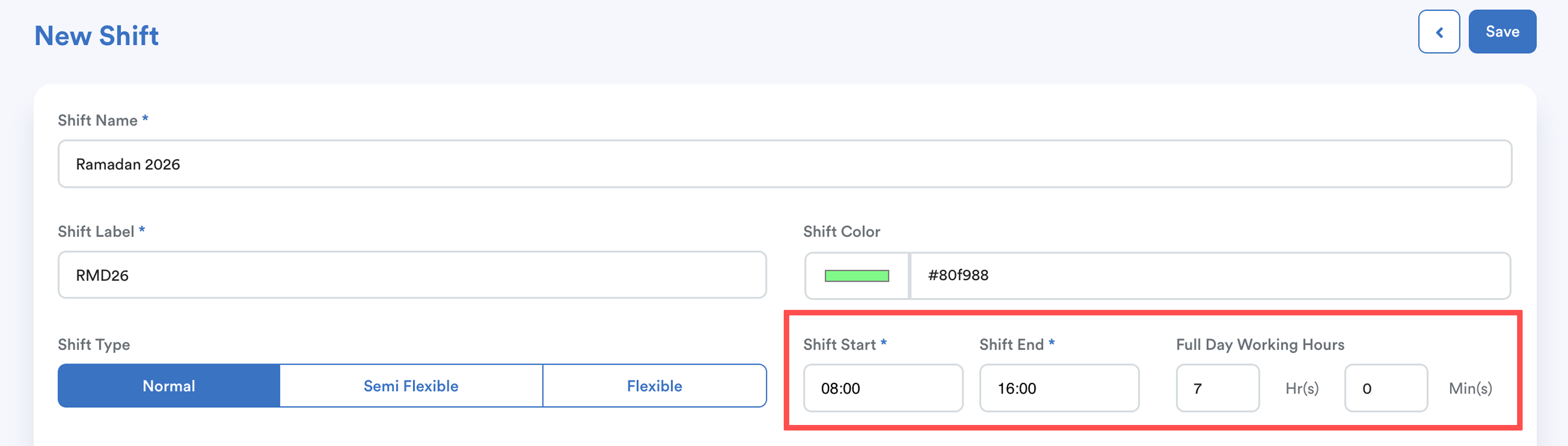 Tips: Don’t change overtime, holiday, or attendance rules here. Only change the shift timing.