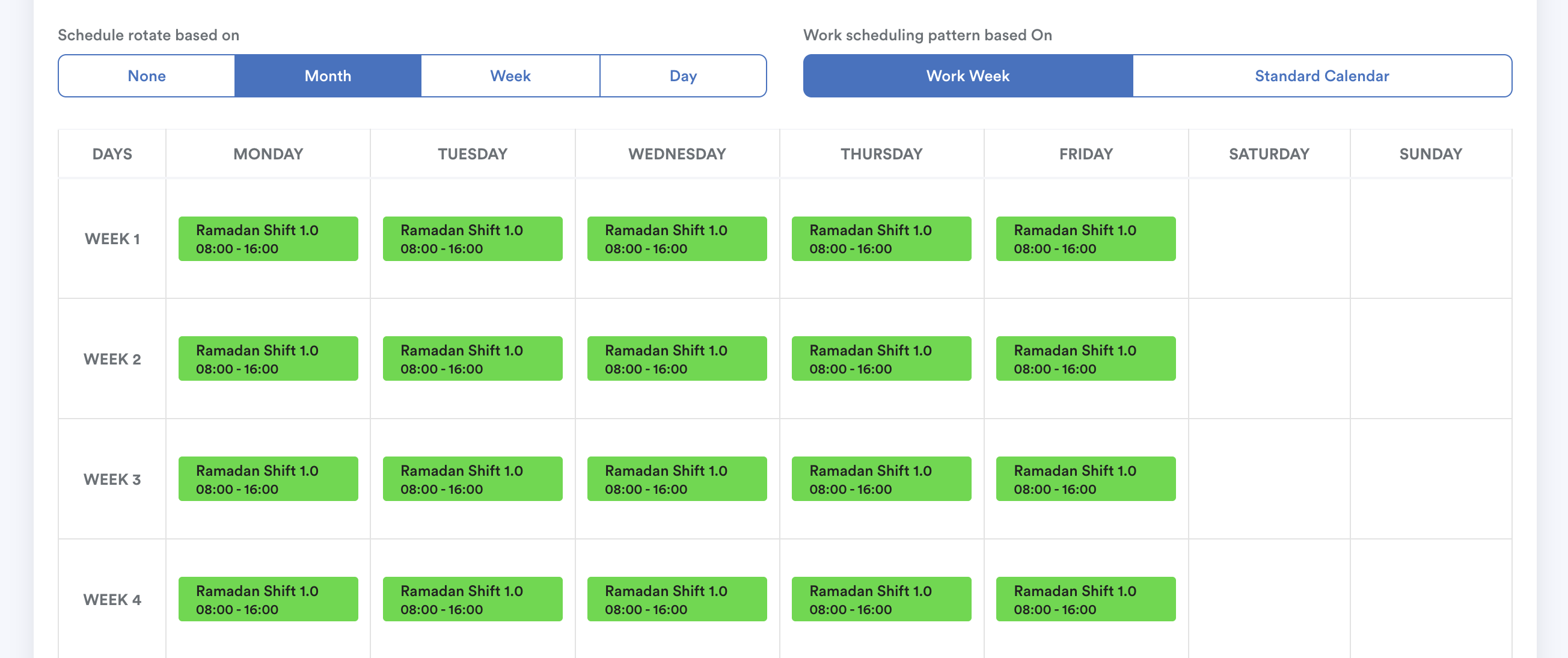 However, make sure to replace the existing shift with the Ramadan shift inside the schedule template.