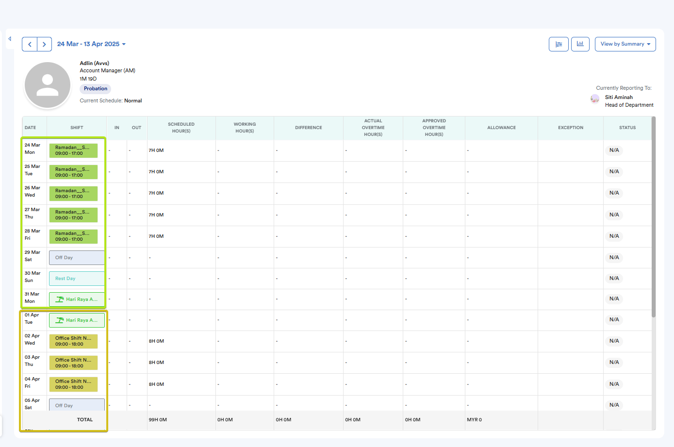 During Ramadan, working hours are usually shortened. To accommodate this, you can create a separate Ramadan schedule and assign it for the whole month.